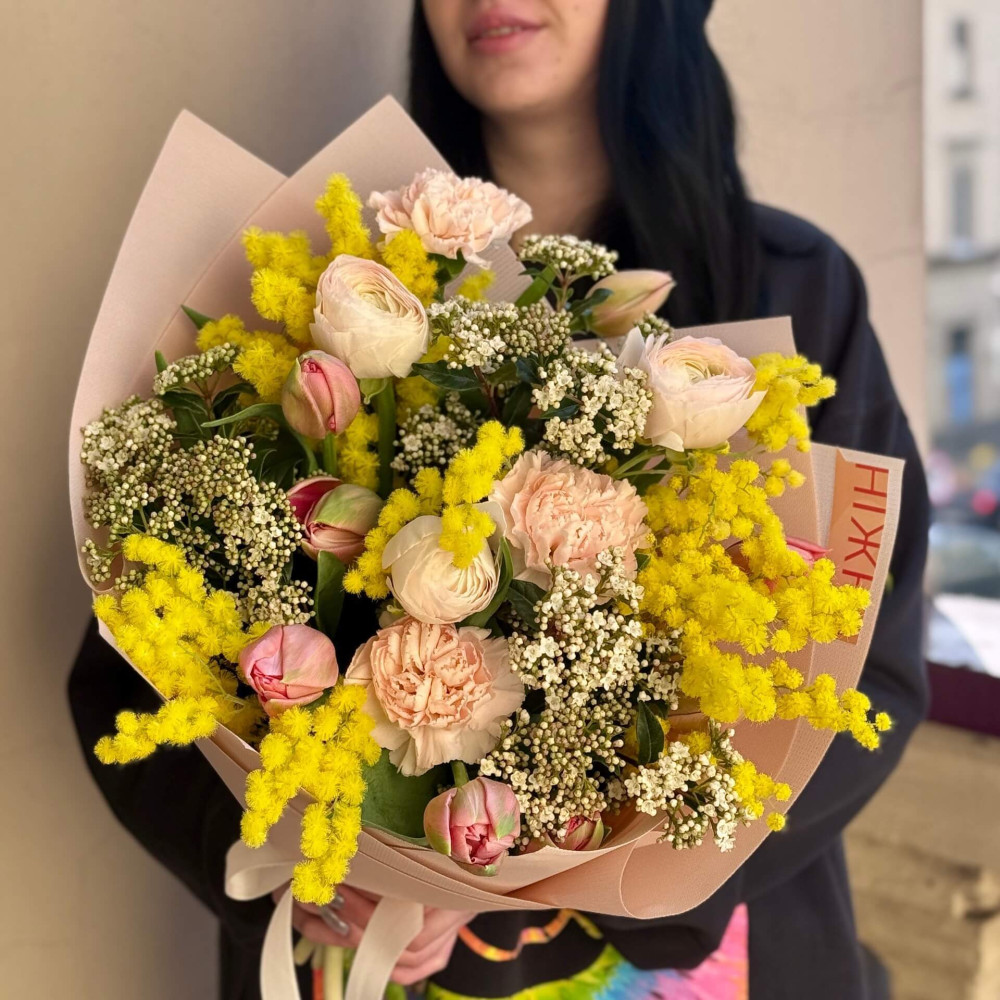 Квіти: Мімоза, Вібурнум, Ранункулюс, Діантус (Гвоздика), Тюльпан