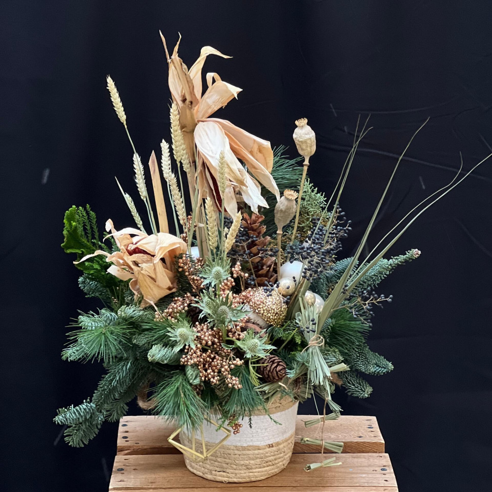 Квіти: Нобіліс (ялинка), Папавер (Мак), Вібурнум (ягоди), Ерінгіум, Кукурудза, Шишки, Криптомерія, Пінус, Пшениця, Шинус, Ялівець, Очерет, Декор