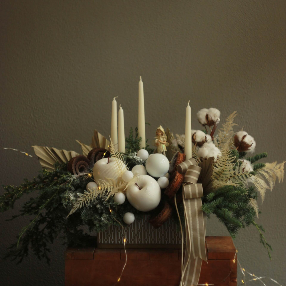 Зима нарешті вже прийшла і ми приготували для Вас атмосферну, затишну, припорошену пухким сніжком композицію для того, щоб навіяти тепло та довгоочікуване свято у Ваш дім.