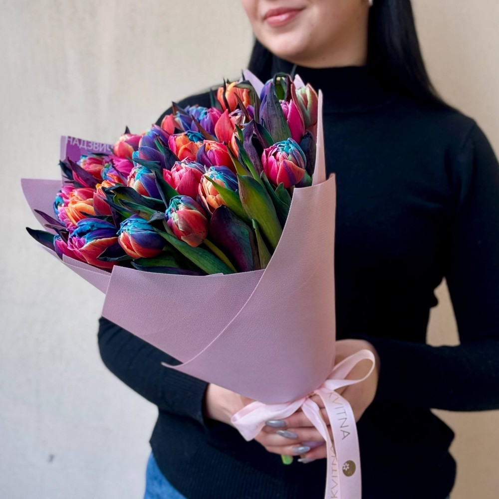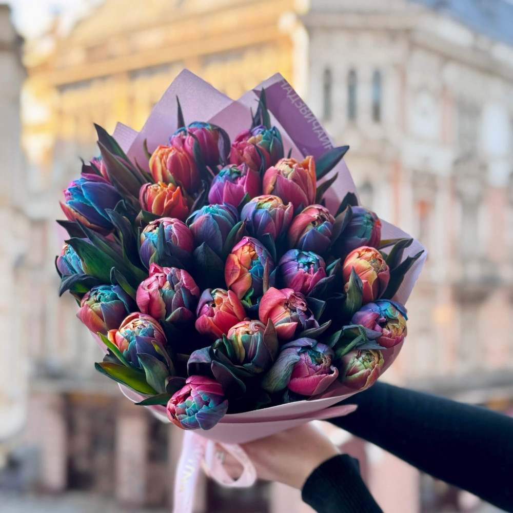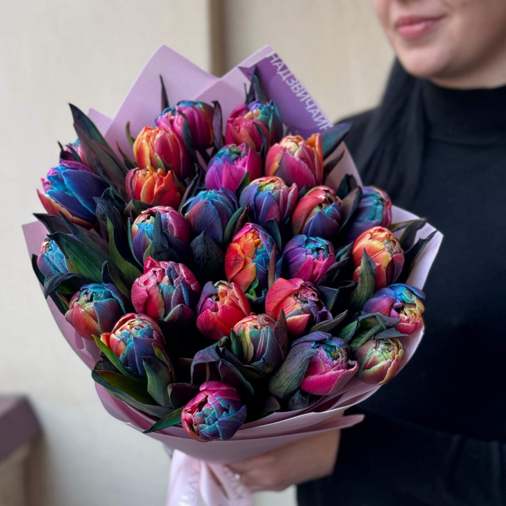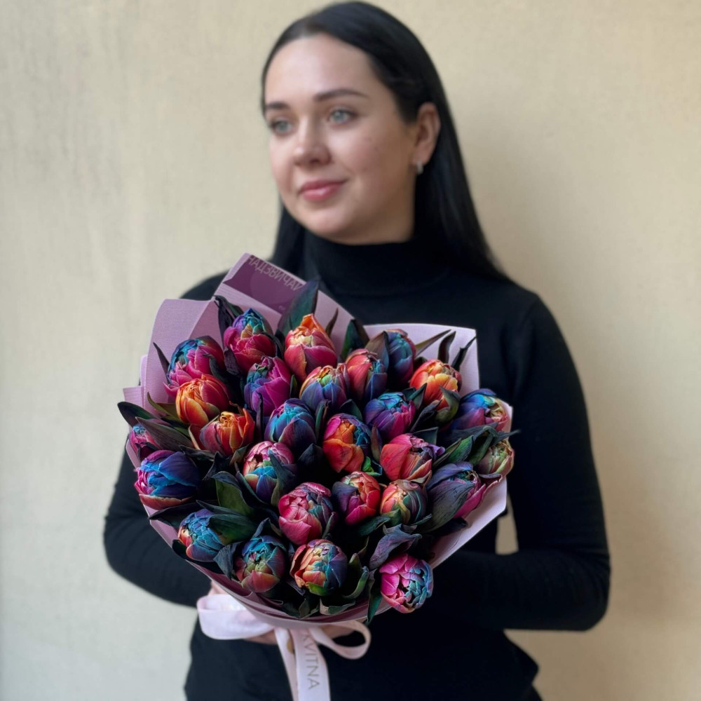 - Як замовити Різнобарвні півонієвидні тюльпани Rainbow у букеті «Весняні вітражі»? ❯