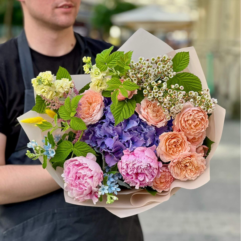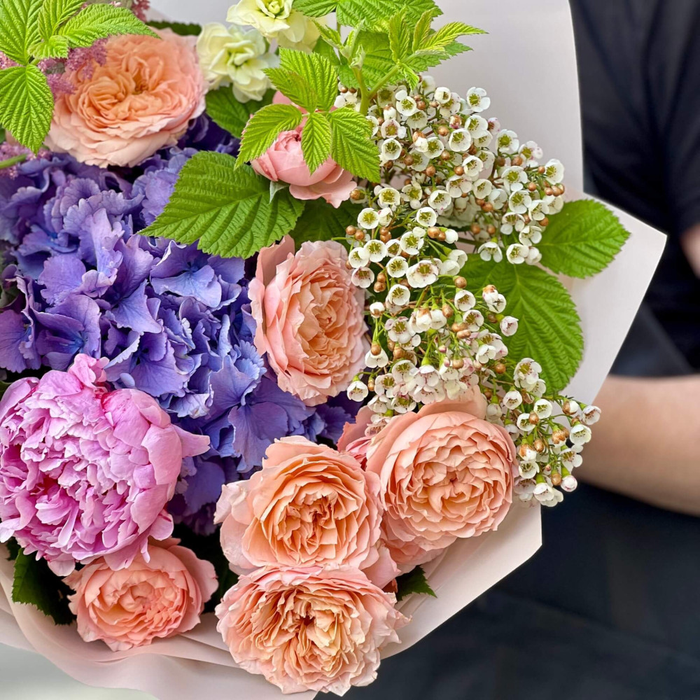 Квіти: Гортензія, Матіола, Хамелаціум, Троянда піоновидна кущова, Малина (листя), Оксіпеталум, Півонія, Лагурус, Астільба