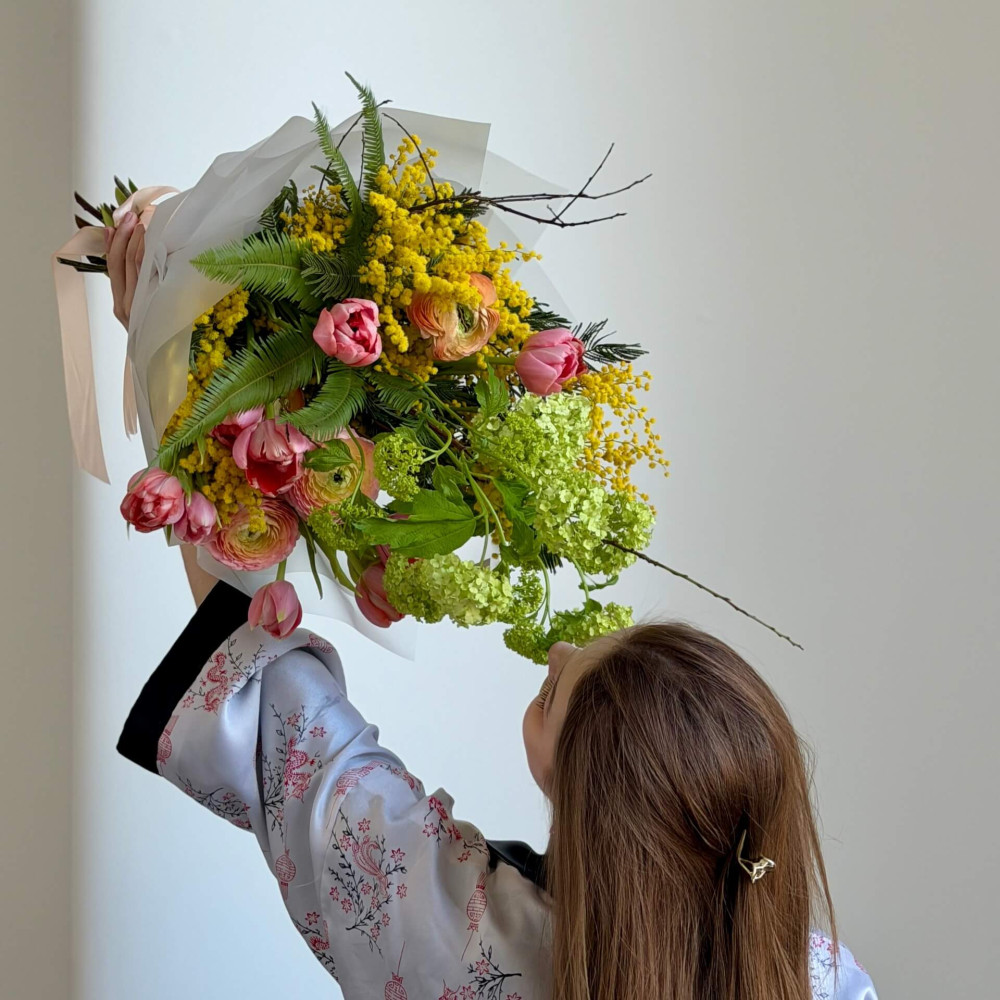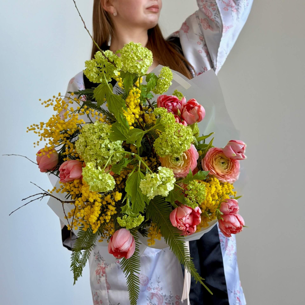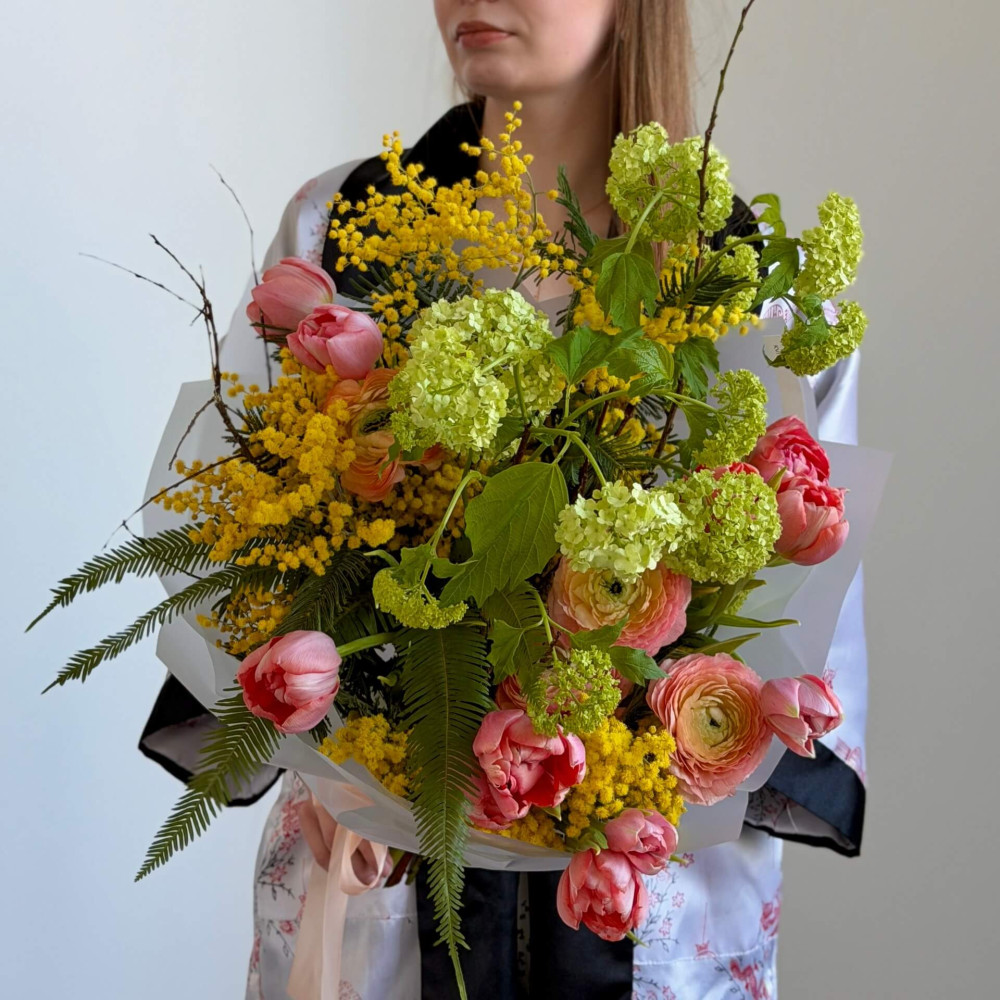- Як замовити Різнорівневий яскравий букет з вібурнумом та тюльпанами «Весняний щебет»? ❯