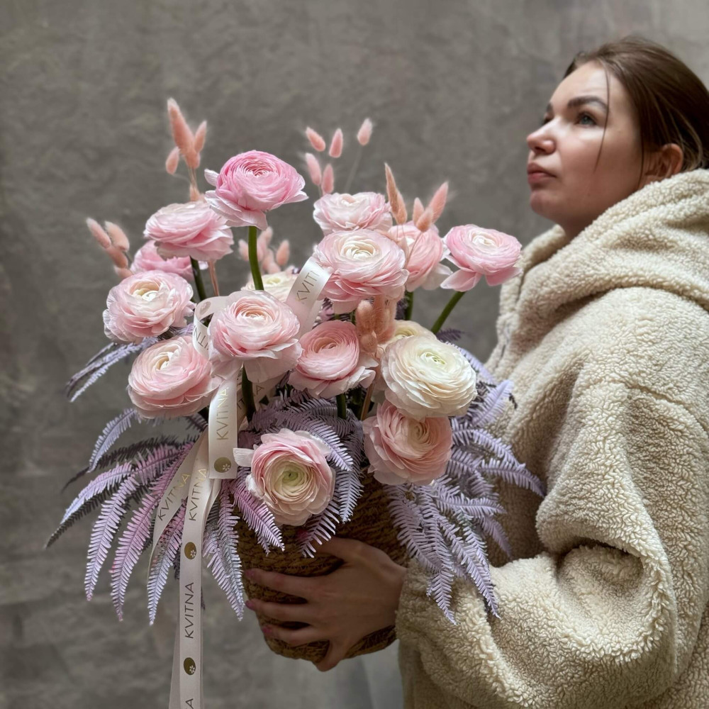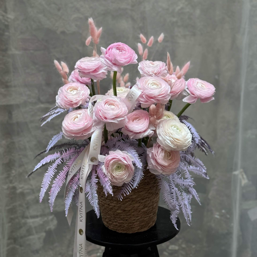 Мереживна, легка композиція в кольорах світанкових сутінків – ніжний рожевий пишних круглих квітів ранункулюса і світлий лавандовий чудового листя папороті амбрели. Подаруй диво світанку у квітковій формі!