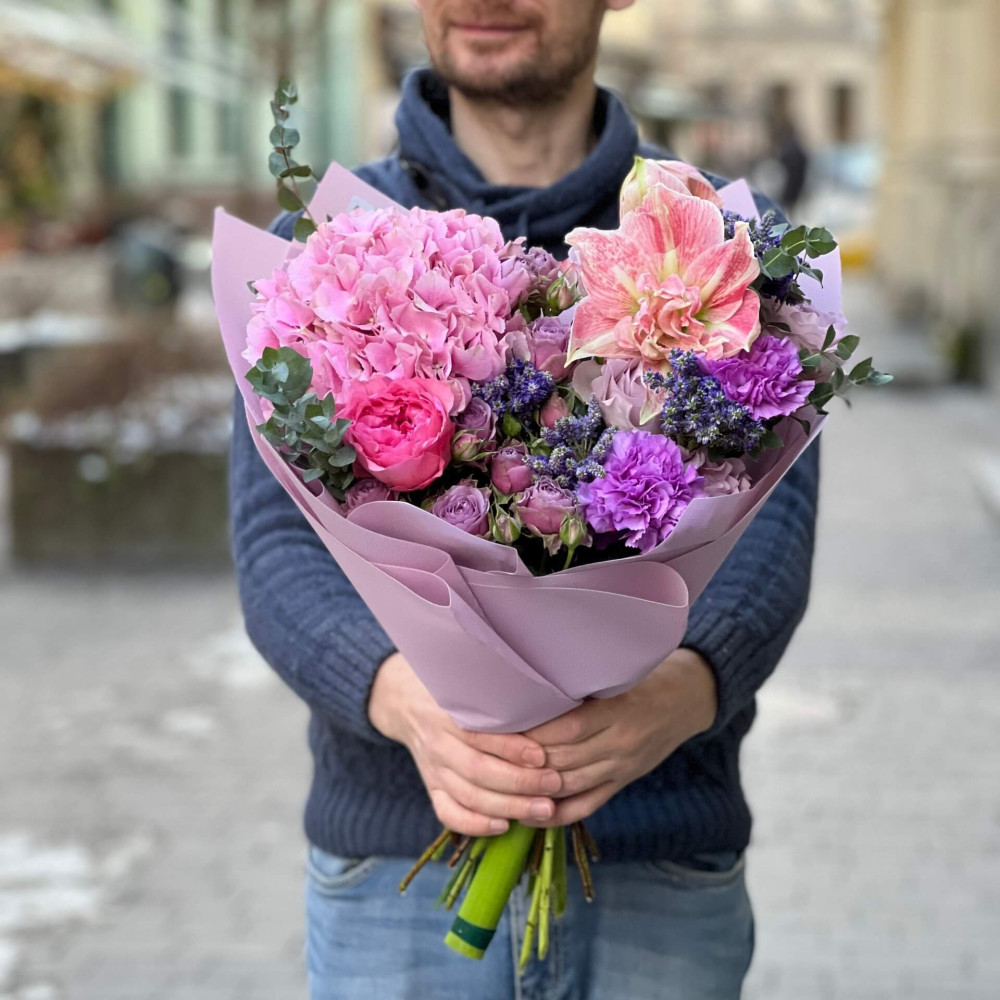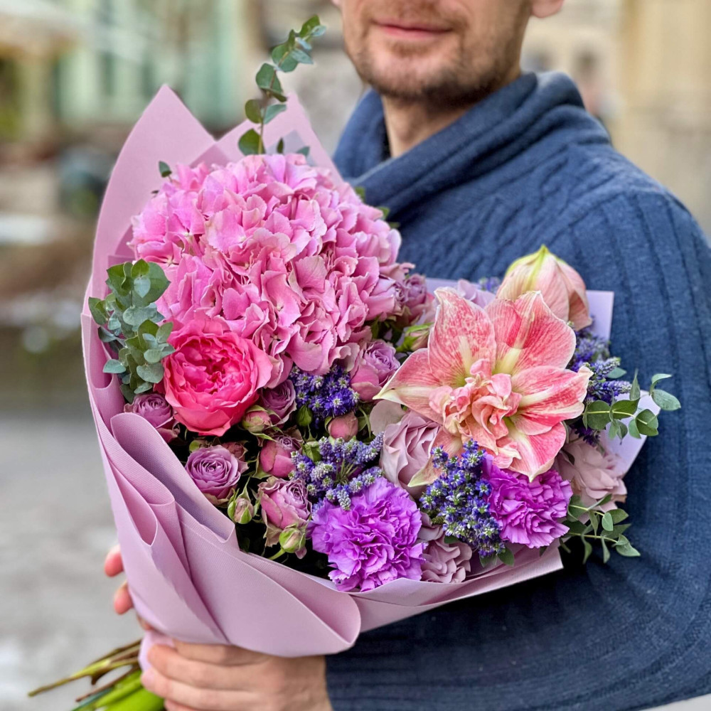 - Як замовити Романтичний букет з рожевим амарилісом «Фіалкова вуаль»? ❯