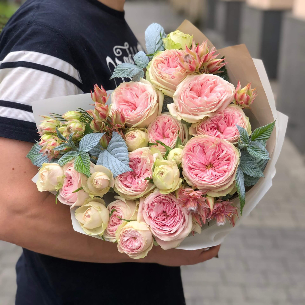 Квіти: Троянда піоновидна, Серрурія, Малина (листя)