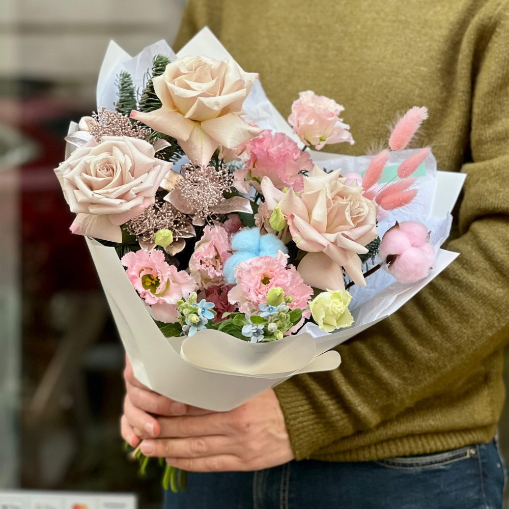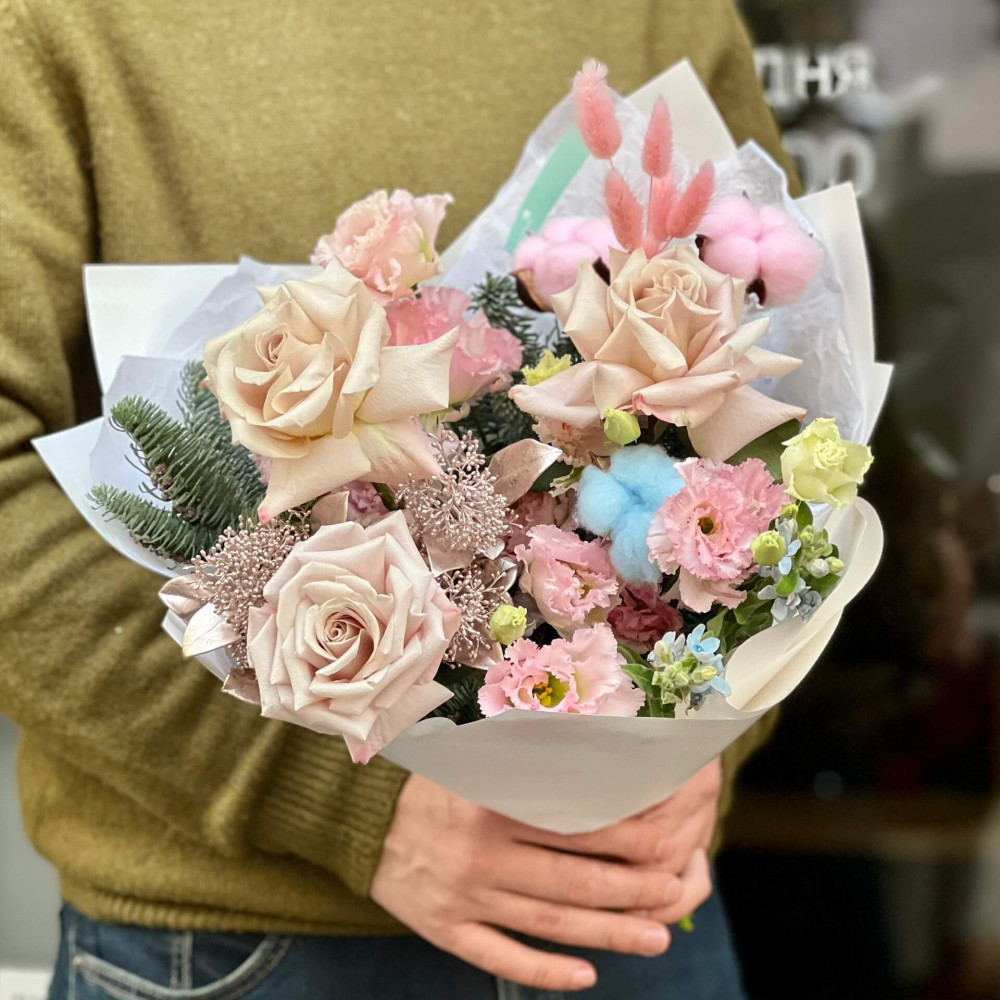Квіти: Троянда, Бавовна, Еустома, Скімія, Нобіліс (ялинка), Оксіпеталум, Лагурус