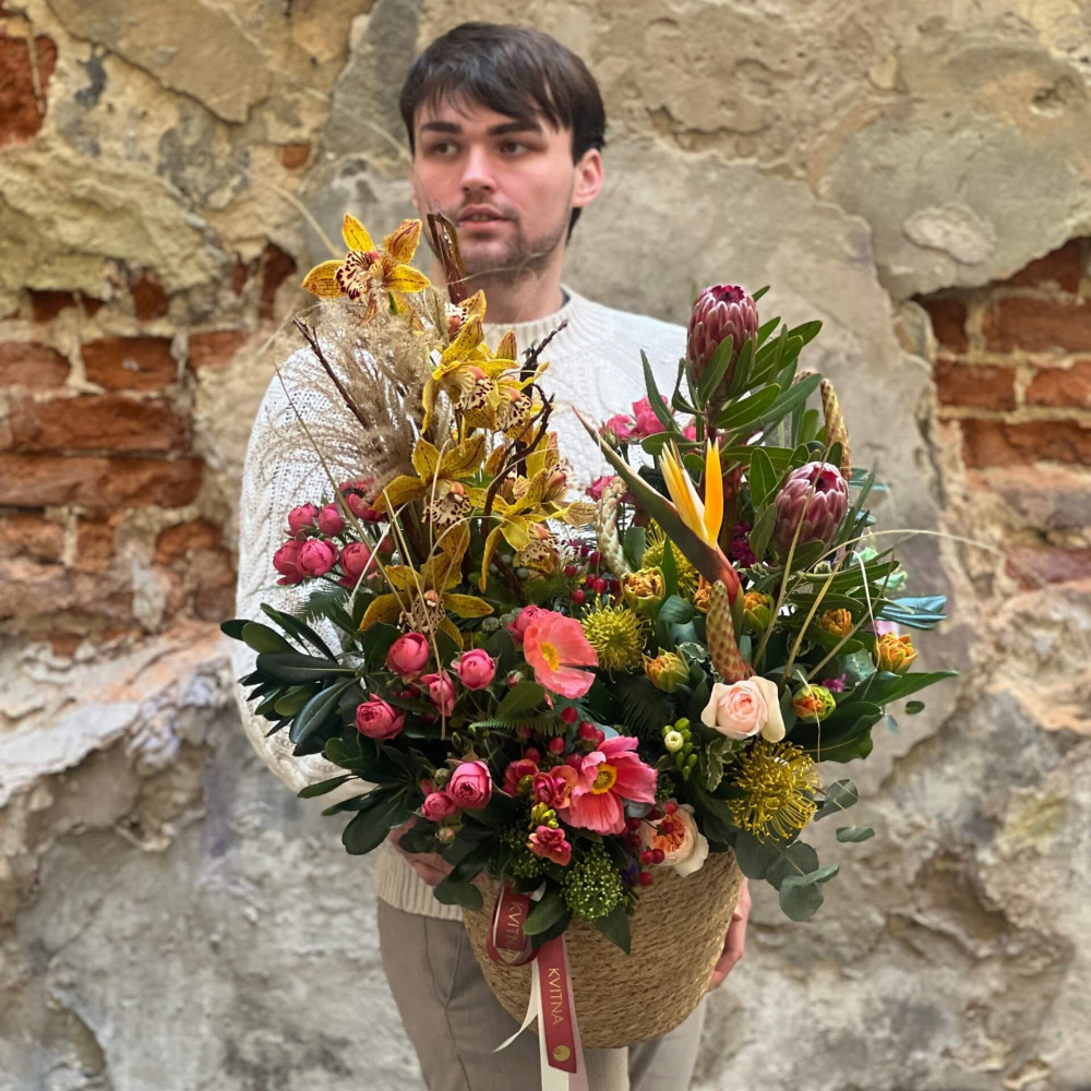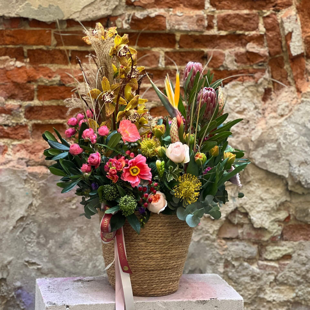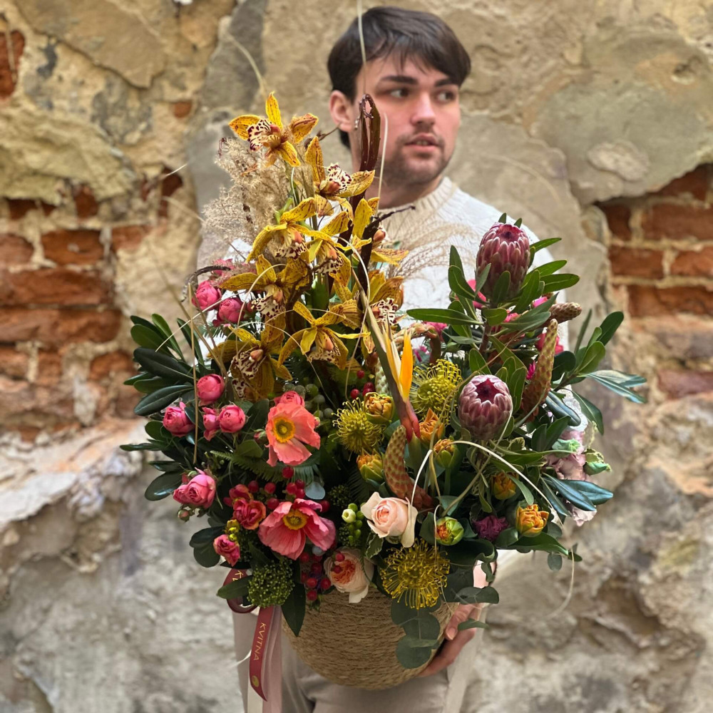 Квіти: Протея, Цимбідіум, Леукоспермум, Папавер (Мак), Тюльпан, Троянда піоновидна кущова, Хіперикум, Брунія, Амбрела, Стреліція, Фрезія, Танацетум, Гіацинт, Еустома