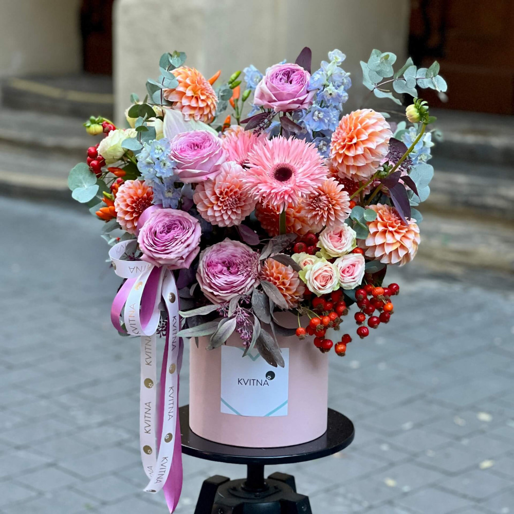 Нехай композиція (коробка, кошик, сніп) з квітами від Квітна тішить Вас якнайдовше!