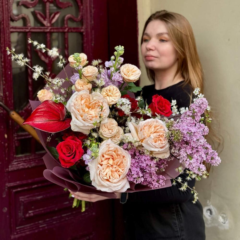 Квіти: Бузок Dark Coster, Троянда, Троянда піоновидна кущова, Антуріум, Діантус (Гвоздика), Прунус