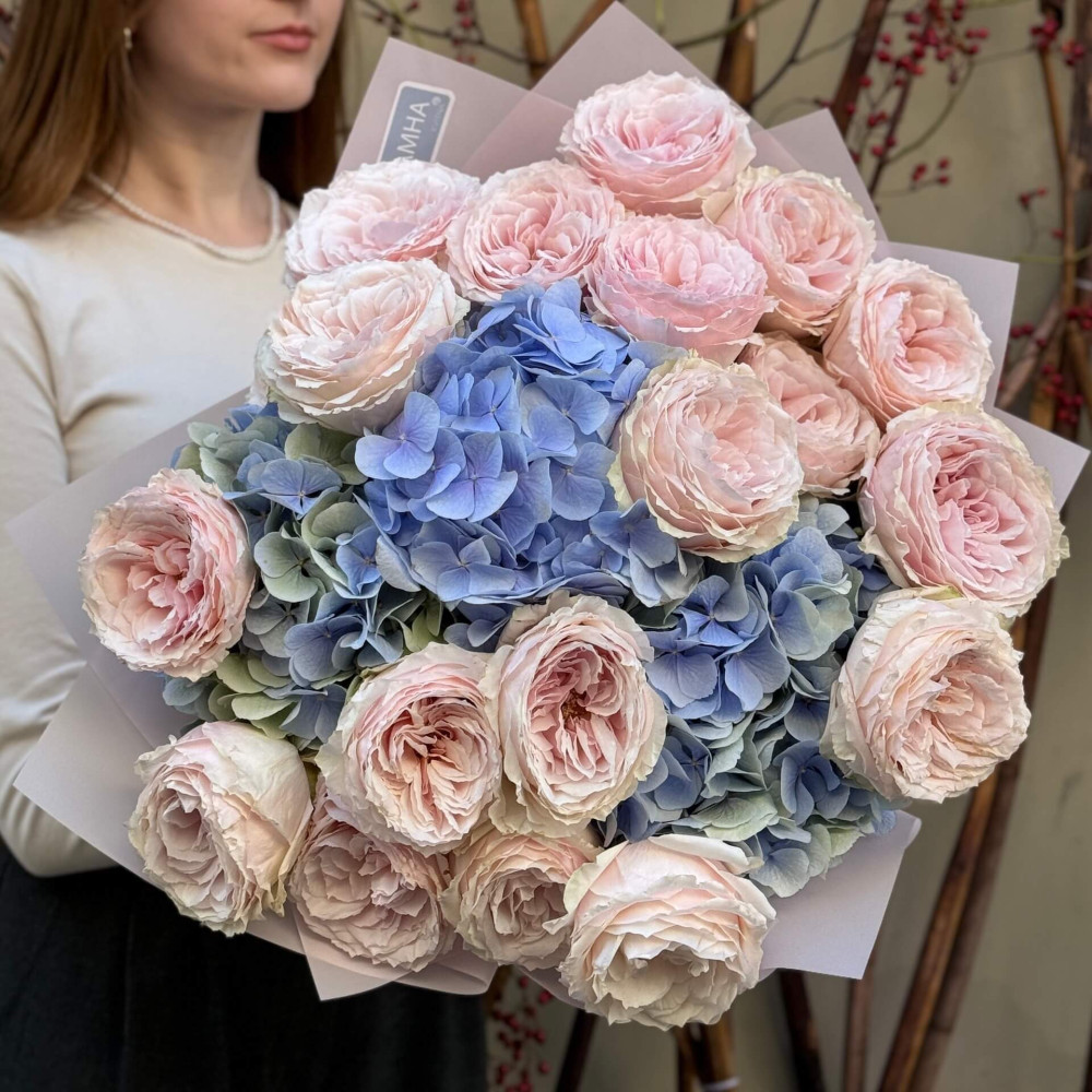 - Як замовити Розкішний букет із піоновидної троянди Tsumugi та гортензії «Барокове мереживо»? ❯