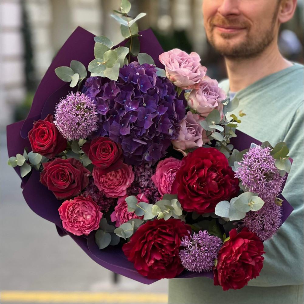 Квіти: Бузок, Гортензія, Алліум, Троянда піоновидна кущова, Троянда, Півонія, Евкаліпт