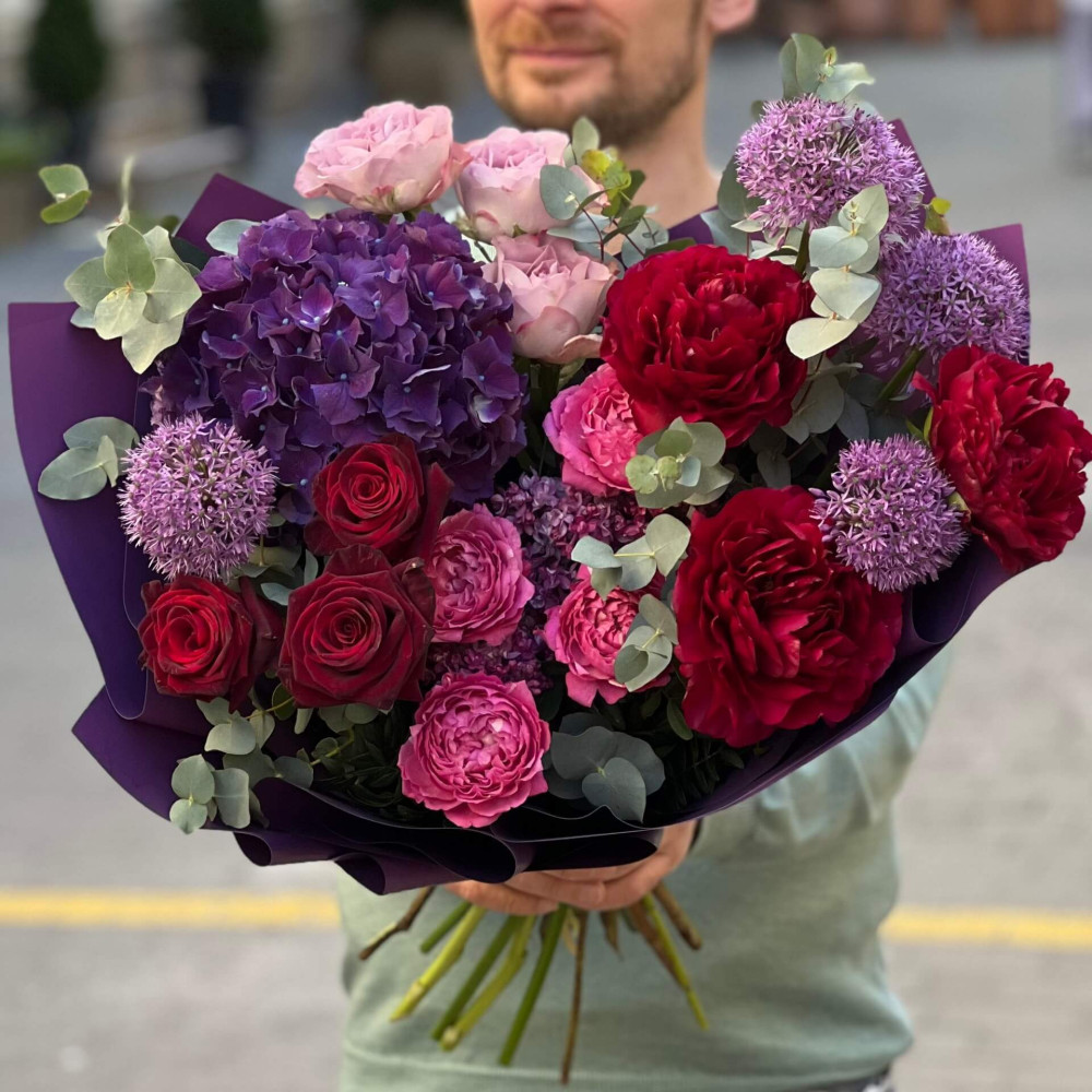 - Як замовити Розкішний букет з півоніями у насичених відтінках «Величний пурпур»? ❯