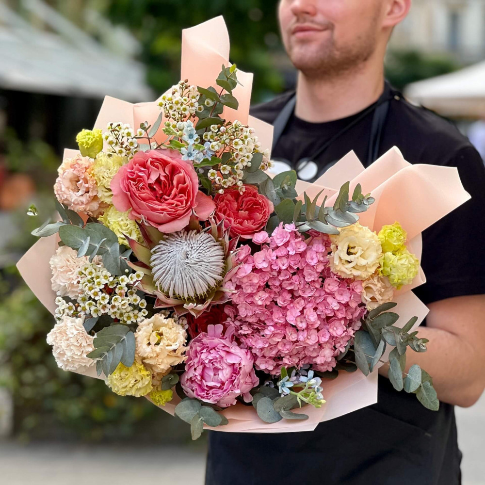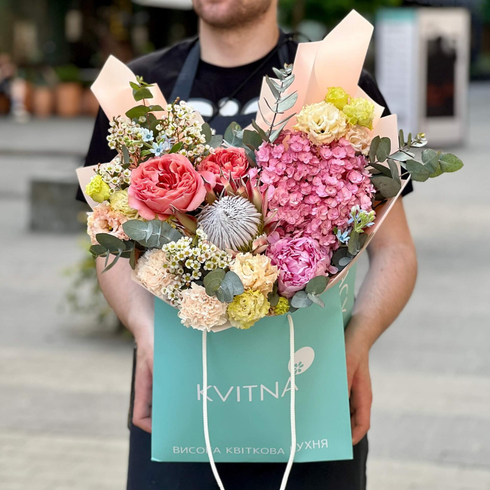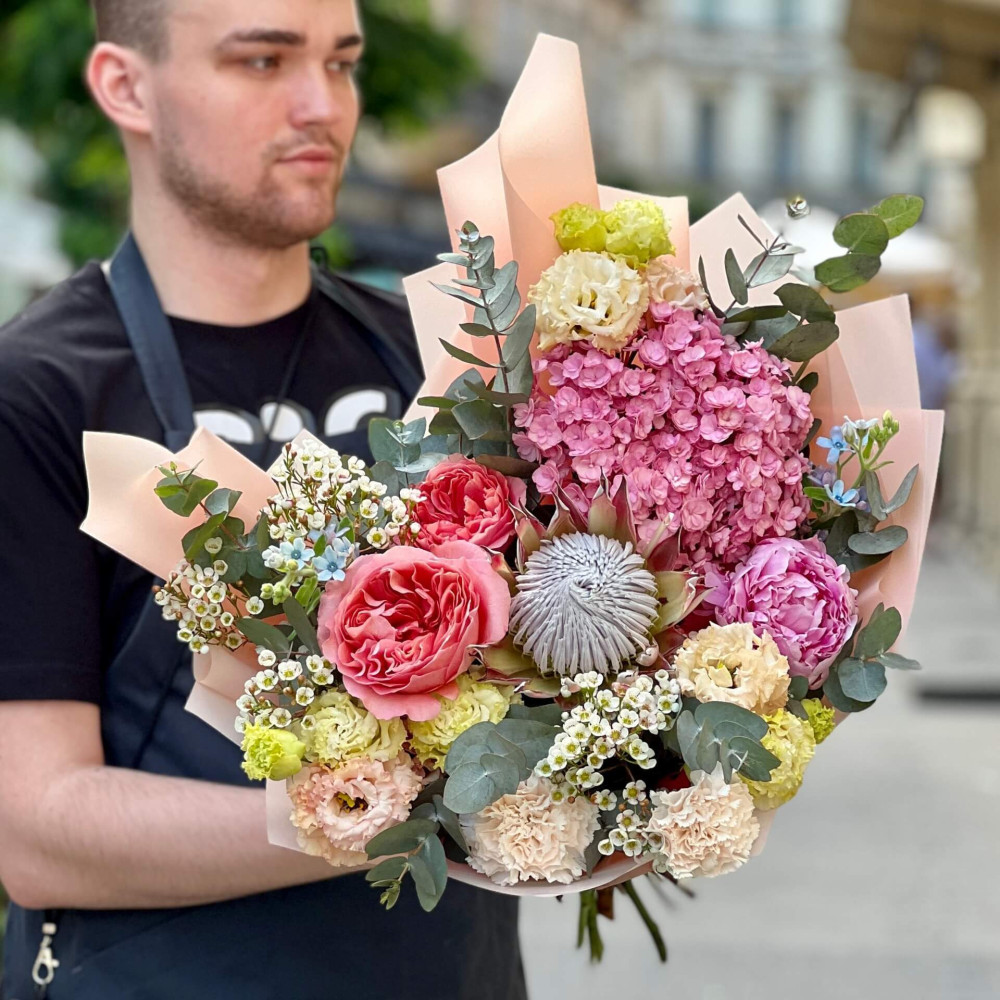 Квіти: Діантус (Гвоздика), Протея, Евкаліпт, Гортензія, Еустома, Хамелаціум, Оксіпеталум, Троянда піоновидна