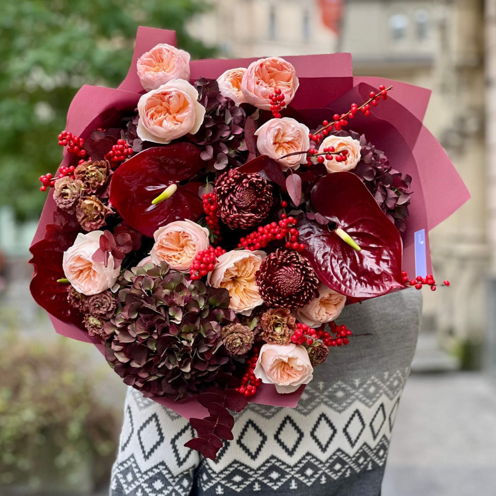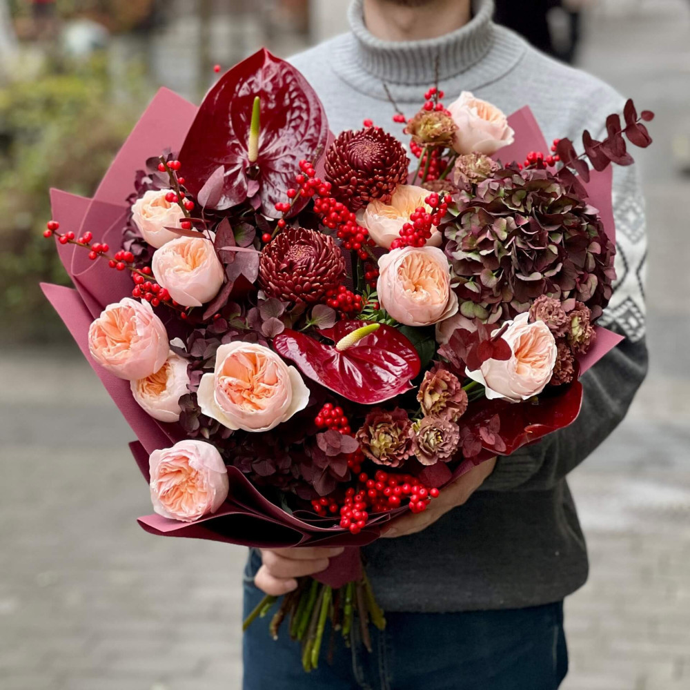 Квіти: Еустома, Гортензія, Антуріум, Троянда піоновидна, Хризантема, Ілекс, Евкаліпт