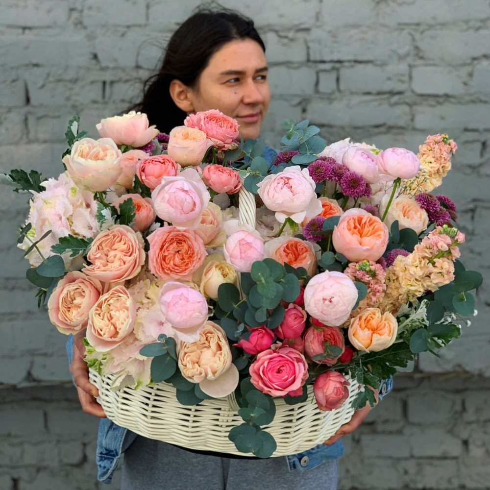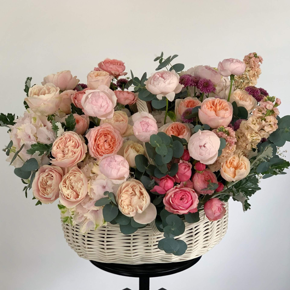 - Як замовити Розкішний кошик квітів «Пудрові обійми»? ❯