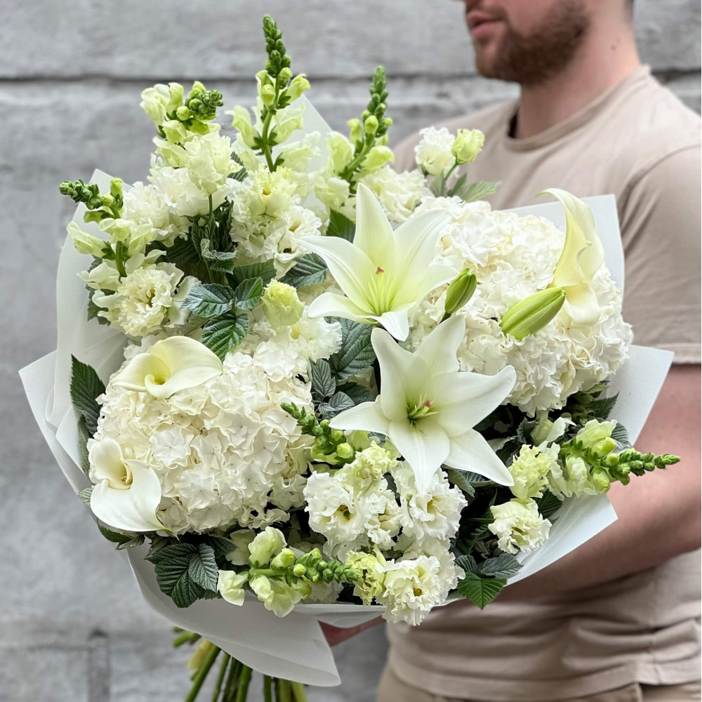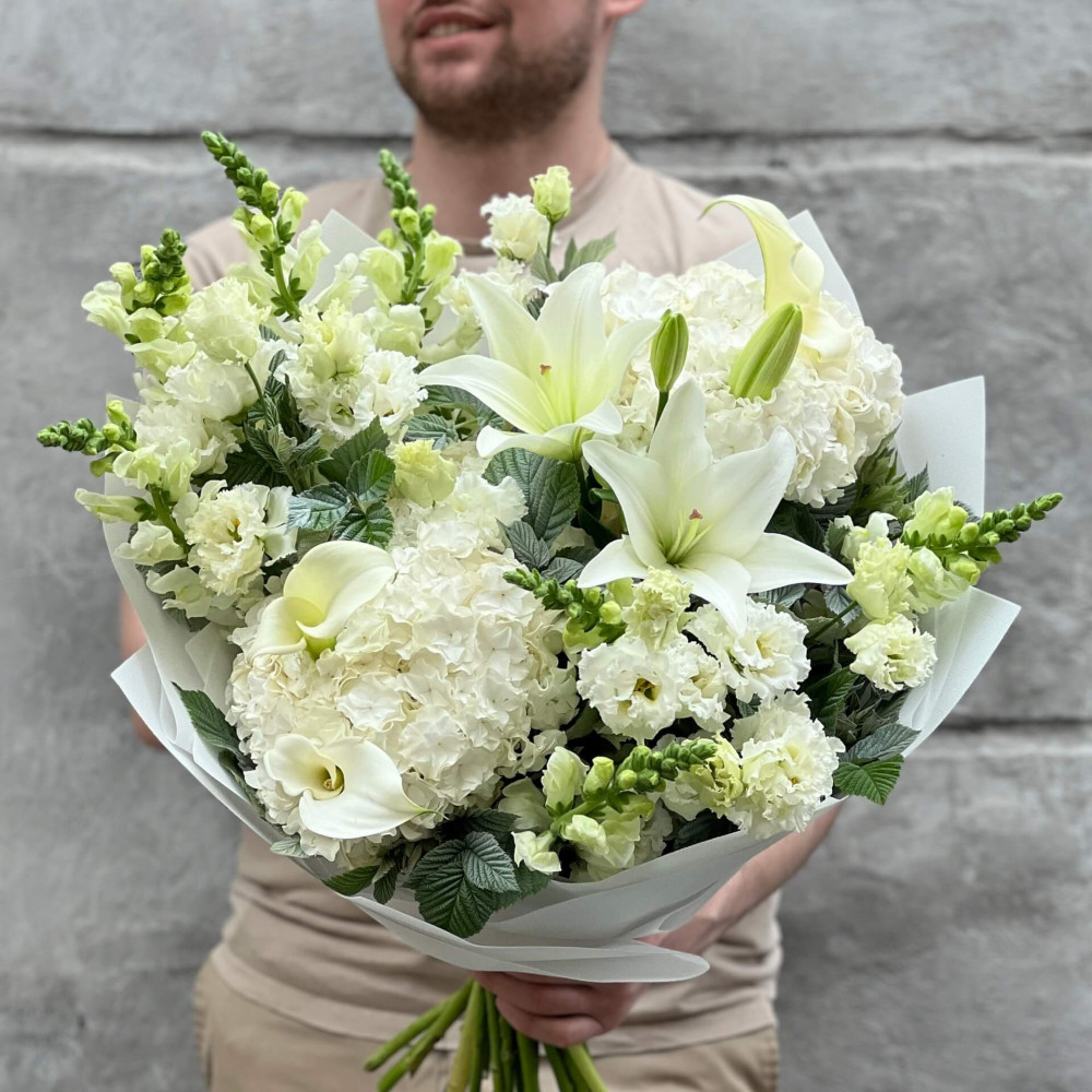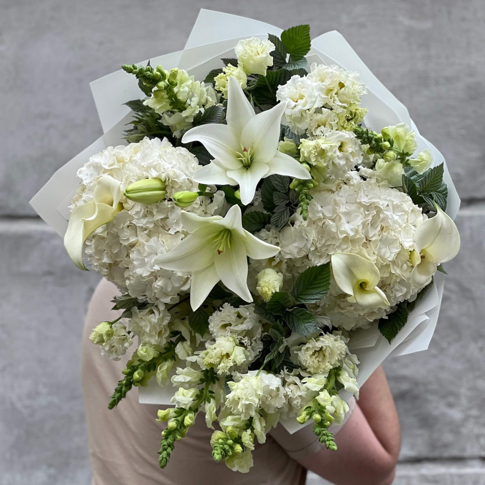 Світлий дизайнерський букет із білих Лілій, Еустоми, білих Кал та Гортензії.