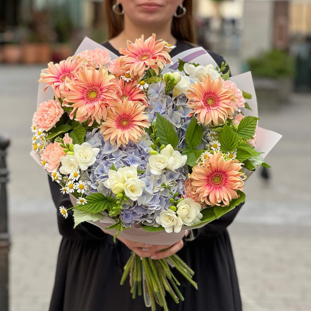 - Як замовити Розкішний букет з герберами «Карамельне небо»? ❯