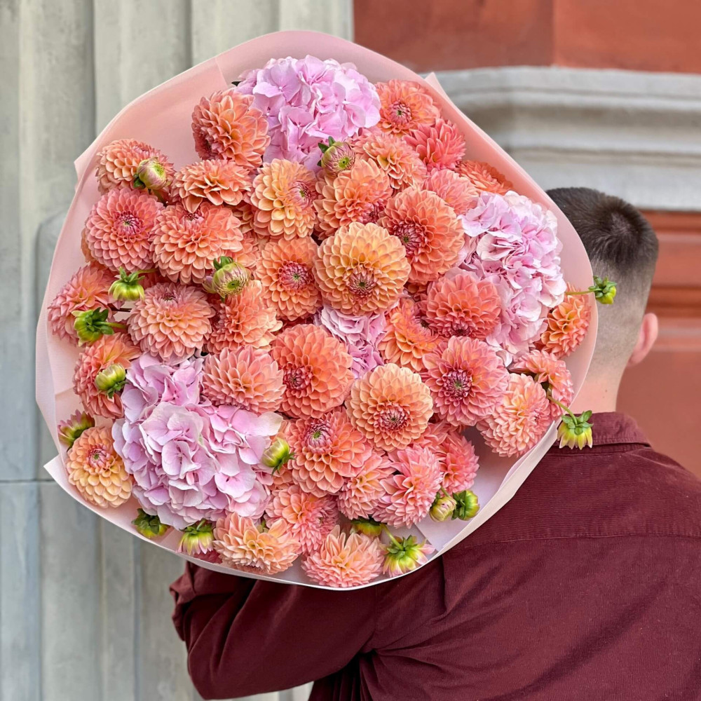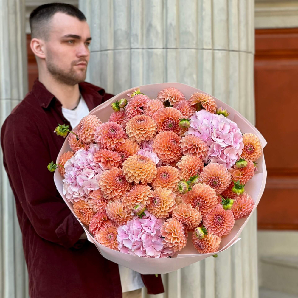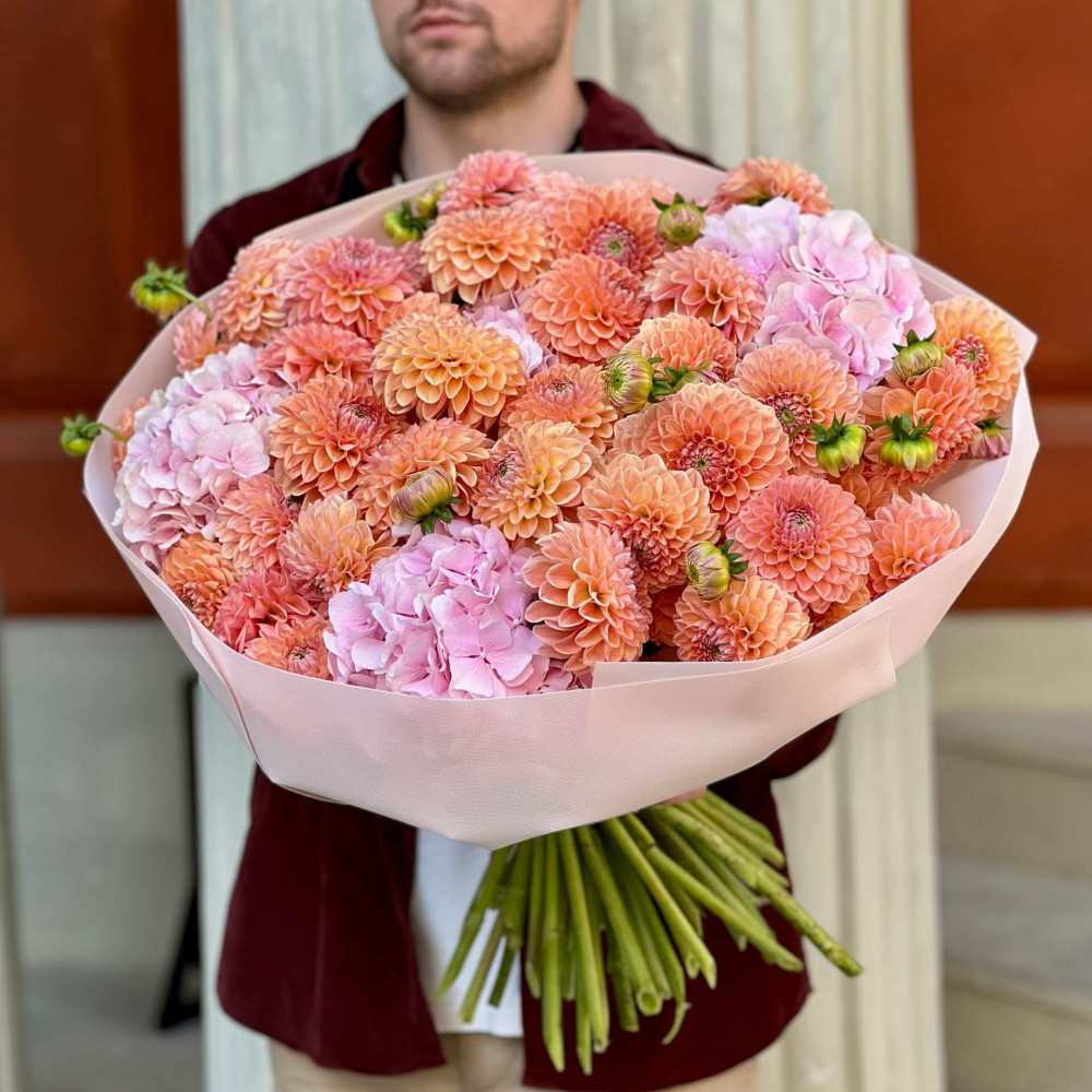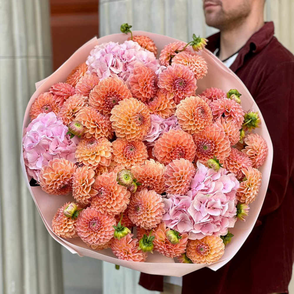 - Як замовити Розкішний об’ємний букет з жоржинами сорту Natalie G та гортензіями «Медове озеро»? ❯