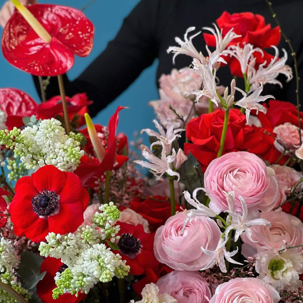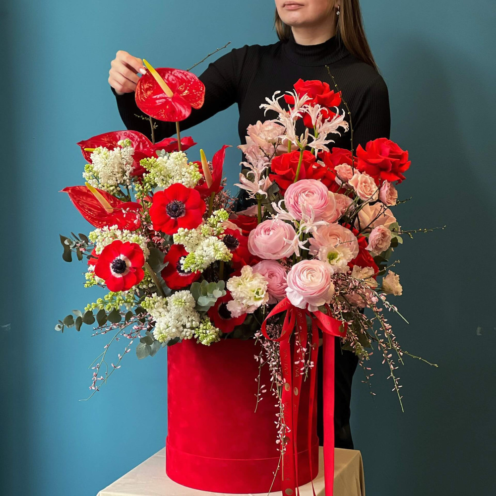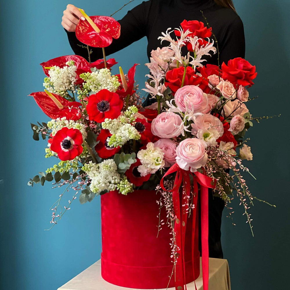 Композиція в чорвоно-біло-рожевих кольорах, де кожна квітка - немов учасник оркестру, який грає пісню про кохання: червоні анемони, троянди, антуріум, білий бузок, рожева витончена неріне і пишний ранкункулюс. Кохання понад усе!