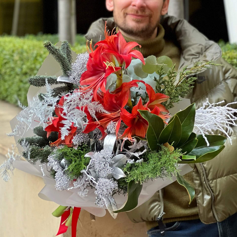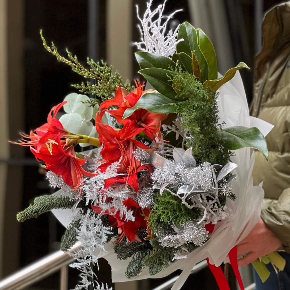 - Як замовити Сніжно-червоний букет із амариліса та мікса хвої «Святкові дні»? ❯