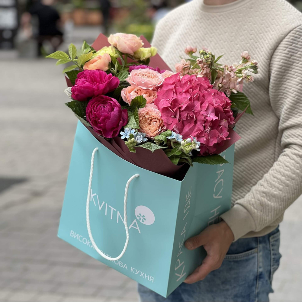 Квіти: Гортензія, Ранункулюс, Діантус (Гвоздика), Малина (листя), Оксіпеталум, Матіола, Півонія