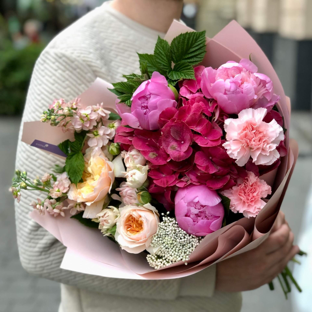 Квіти: Гортензія, Матіола, Троянда піоновидна кущова, Озотамнус, Півонія, Троянда піоновидна, Діантус (Гвоздика), Малина (листя)