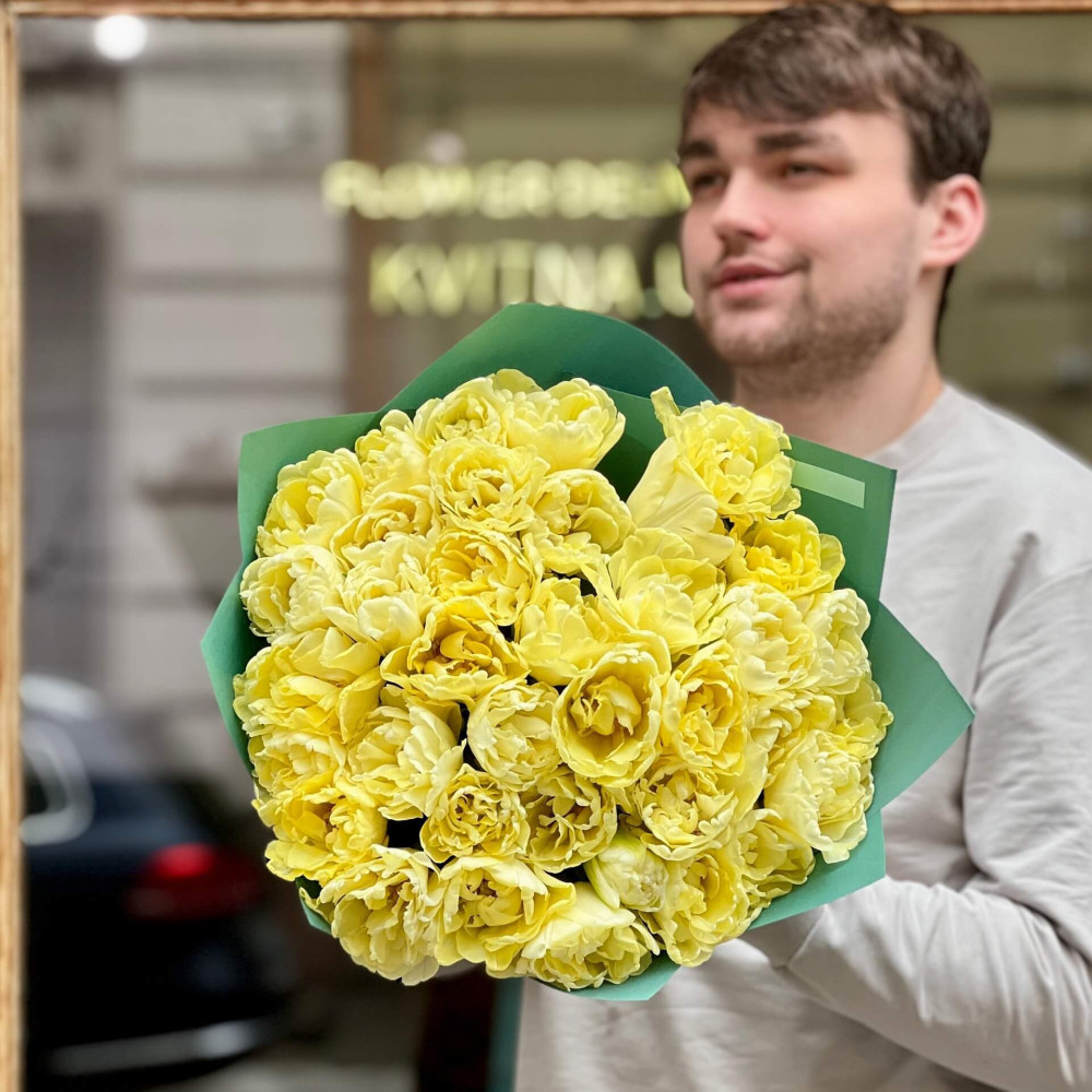 - Як замовити Сонячний букет із 37 піоновидних тюльпанів «Лимонне безе»? ❯