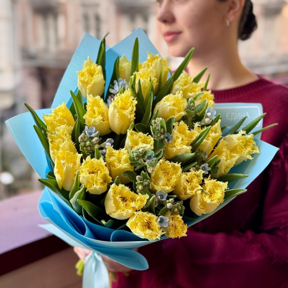 - Як замовити Сонячний букет із бахромчастих тюльпанів та оксіпеталуму «Небо весни»? ❯