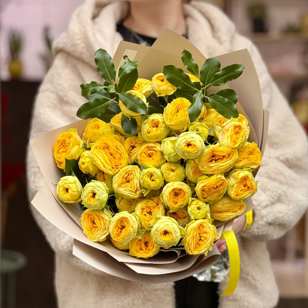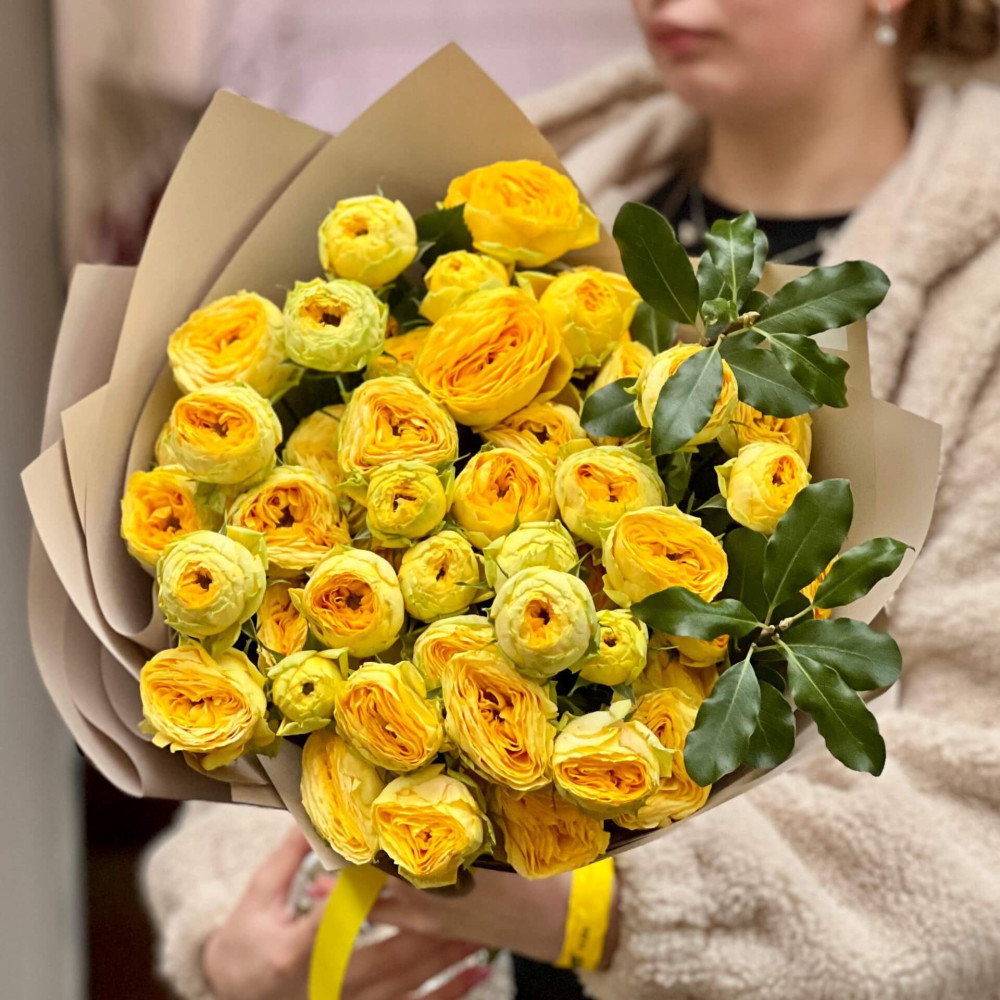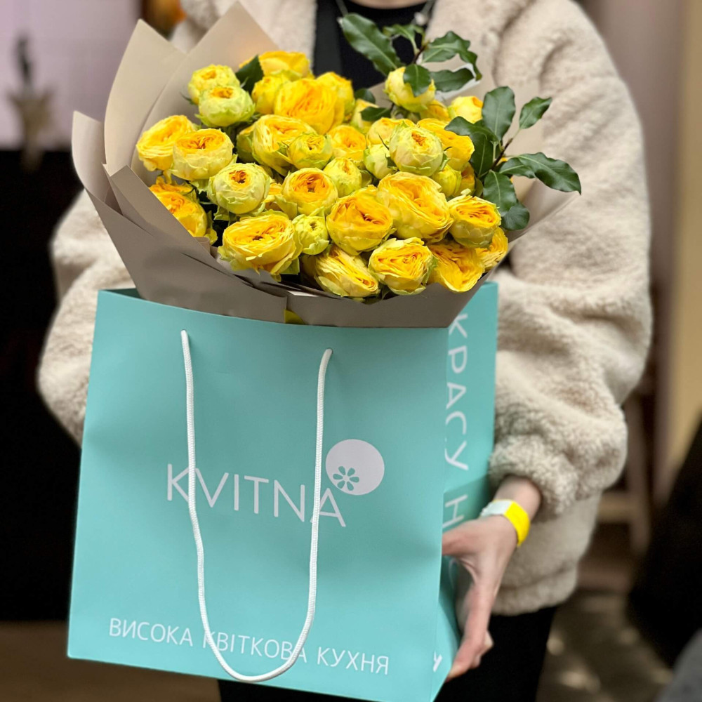 - Як замовити Сонячний букет із кущової піоновидної троянди та рускуса «Енергія тепла»? ❯