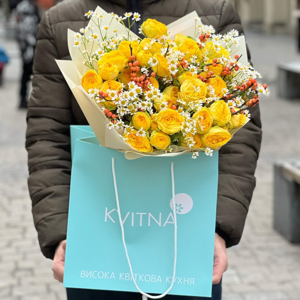 - Як замовити Сонячний букет із піоновидної кущової троянди з танацетумом та ягідками ілексу «Поцілунок щастя»? ❯
