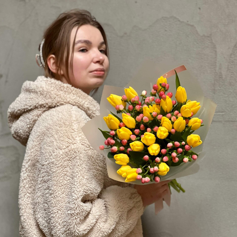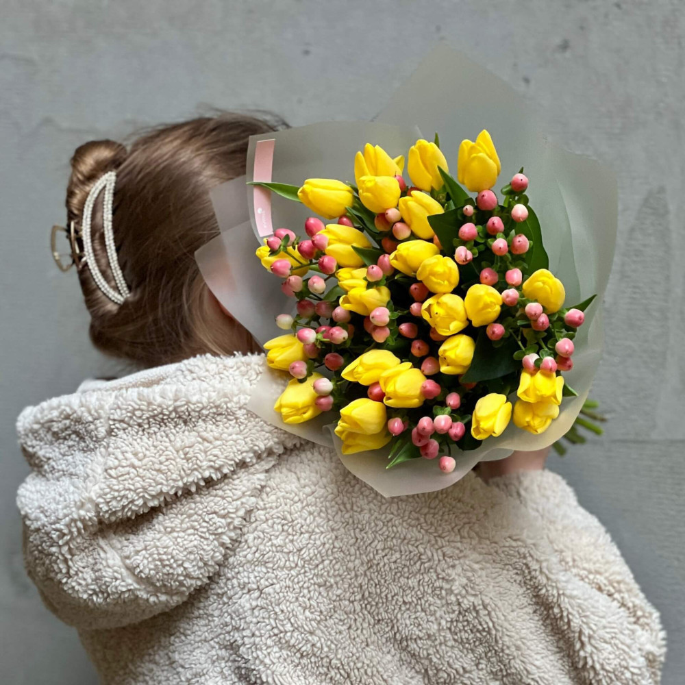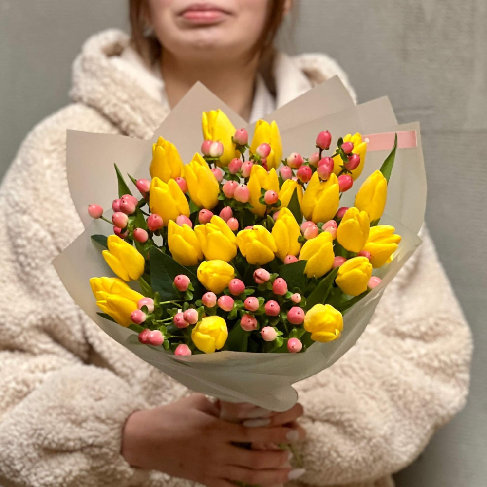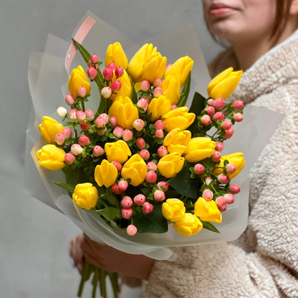 - Як замовити Сонячний букет з тюльпанами та хіперікумом «Яскраві краплинки»? ❯