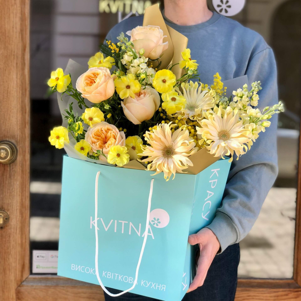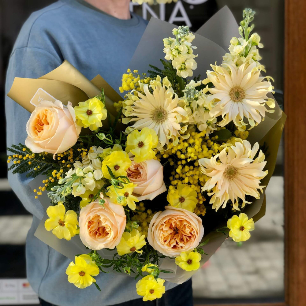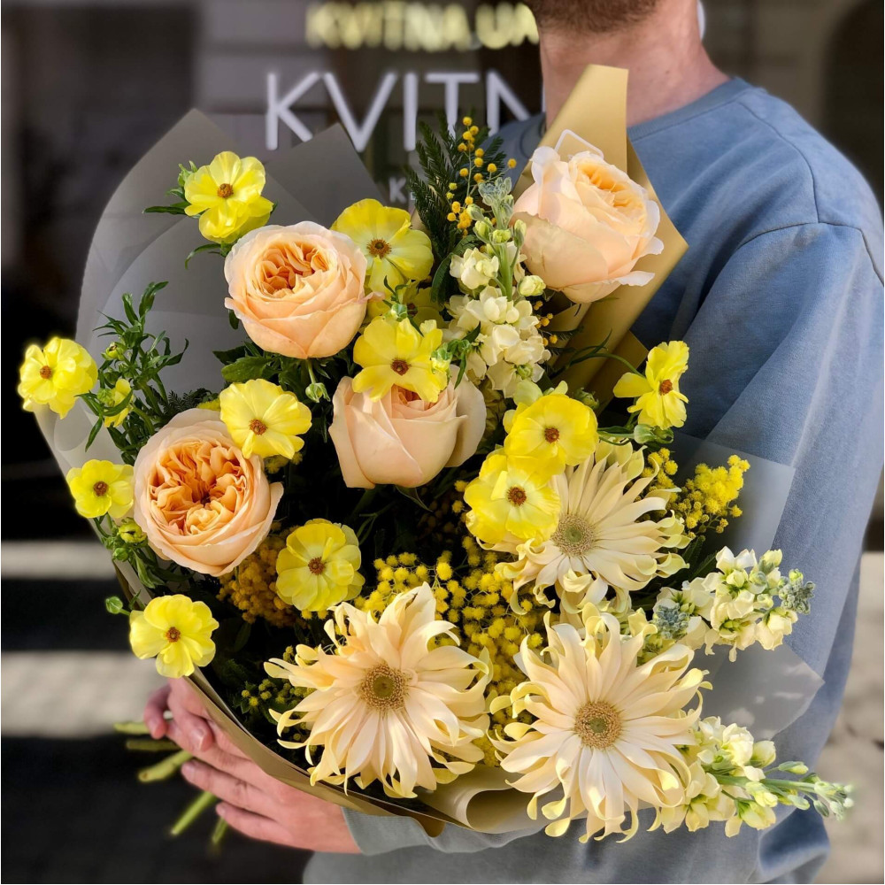 Букет немов відтінки сонячного сяйва: жовта мімоза, кремова гербера та лимонно-жовта ароматна матіола, золотаво-персикові серединки півонієподібної троянди і зеленувато-жовті квіточки ранункулюса, які пурхають поміж троянд. Як пісня про сонечко та сяйво золота.