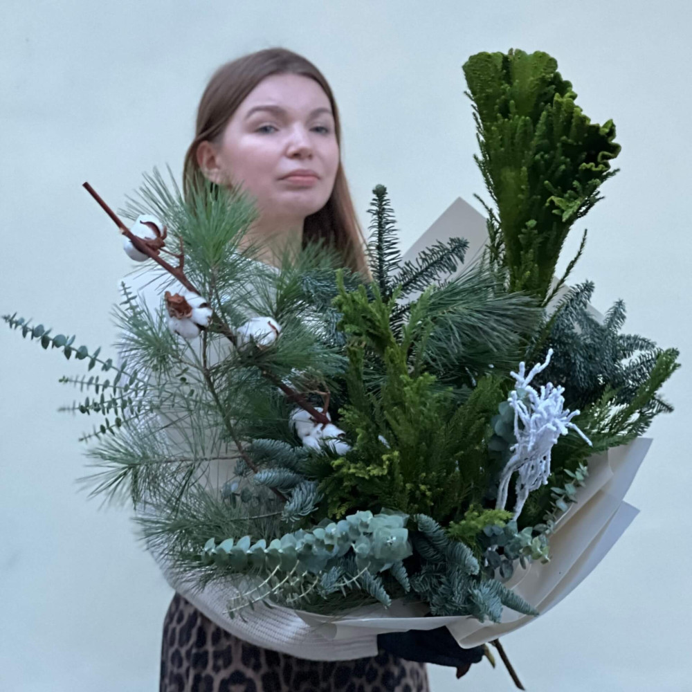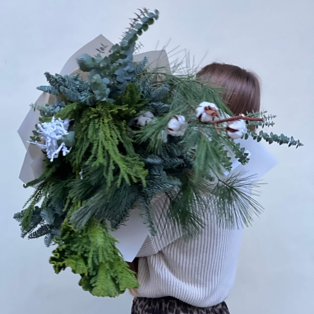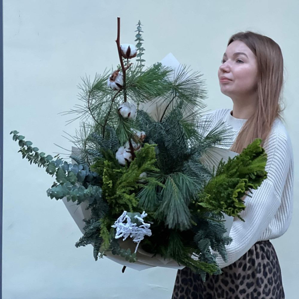 - Як замовити Стійкий букет із різноманітних хвойних «Зимовий затишок»? ❯