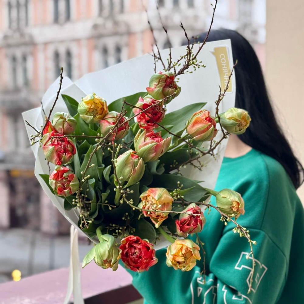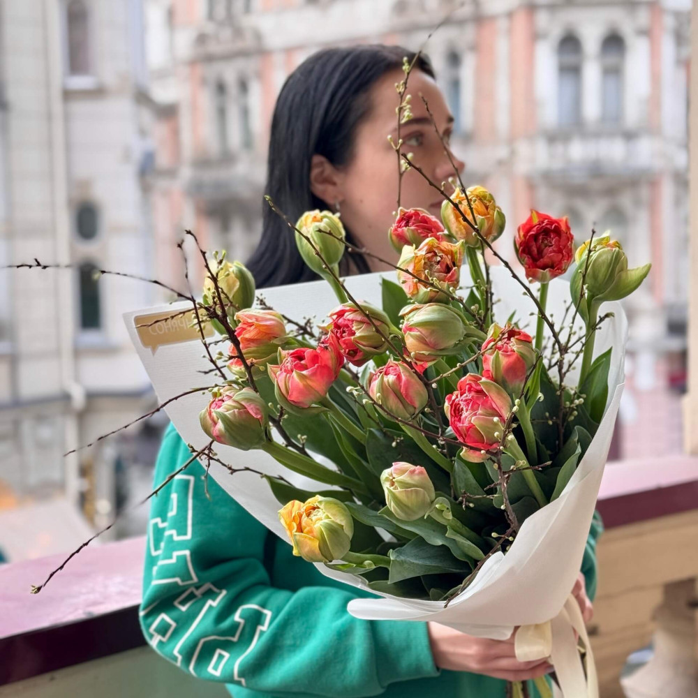 - Ми радимо знімати упаковку з букета і ставити букет в вазу в тій спіральній техніці, яку зробив флорист, тоді букет буде тримати гарну форму і тюльпан дасть свій природній вигин і красиве розкриття.