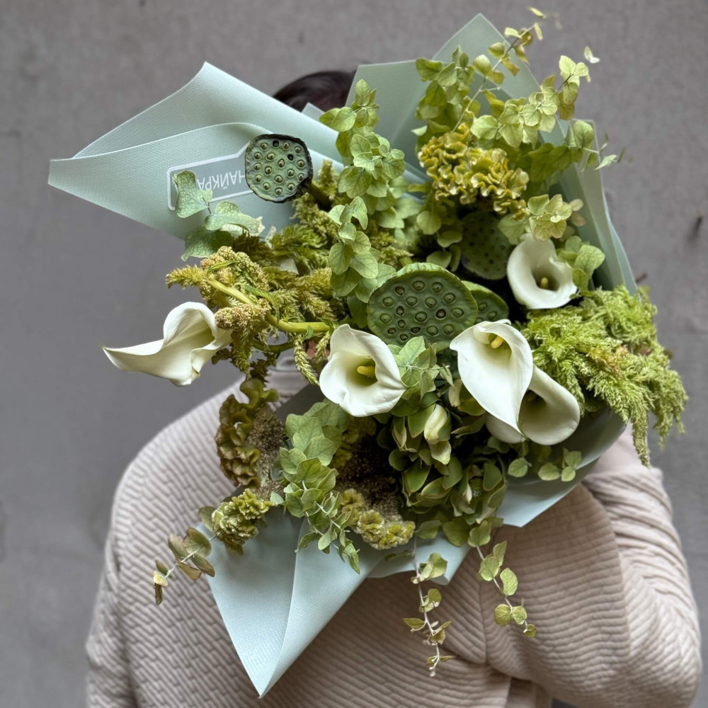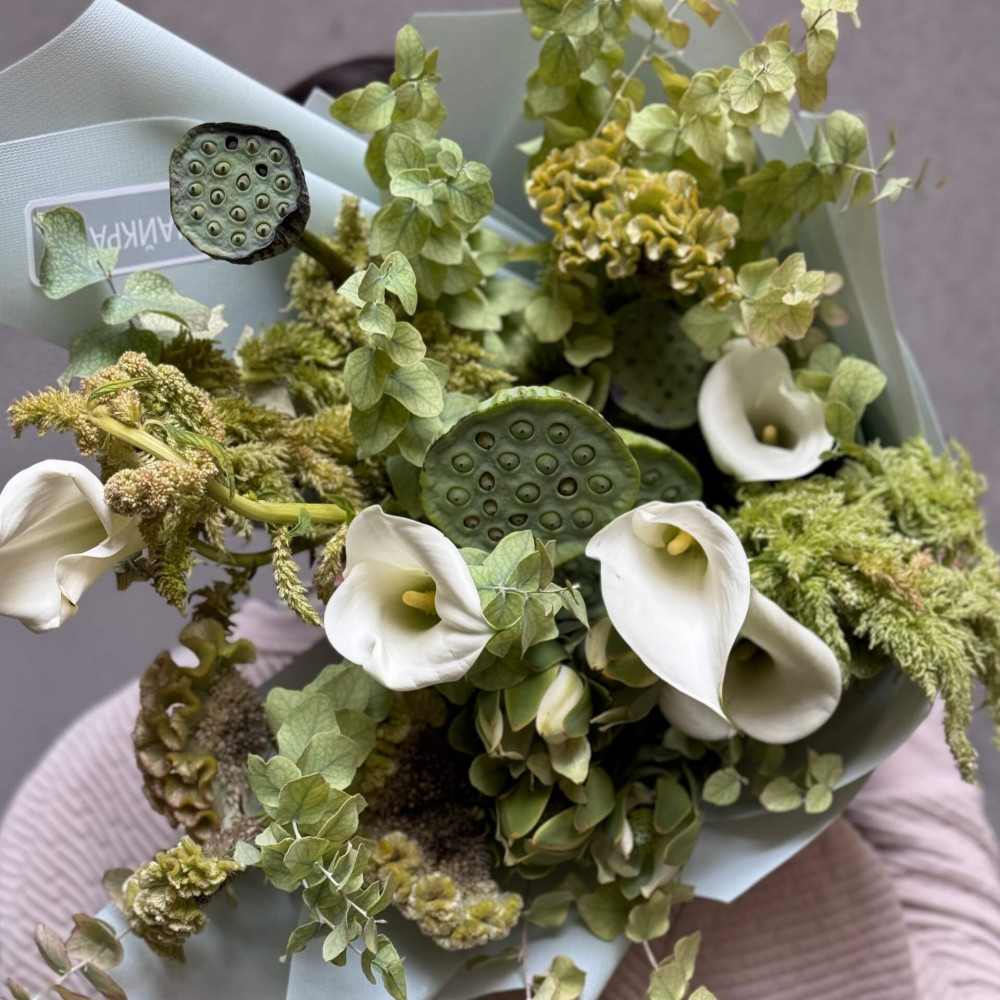 Квіти: Амарант хвостатий, Нелюмбо, Целозія, Леукадендрон, Зантедескія (Кала), Евкаліпт