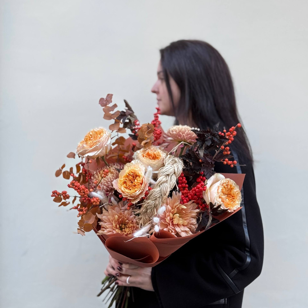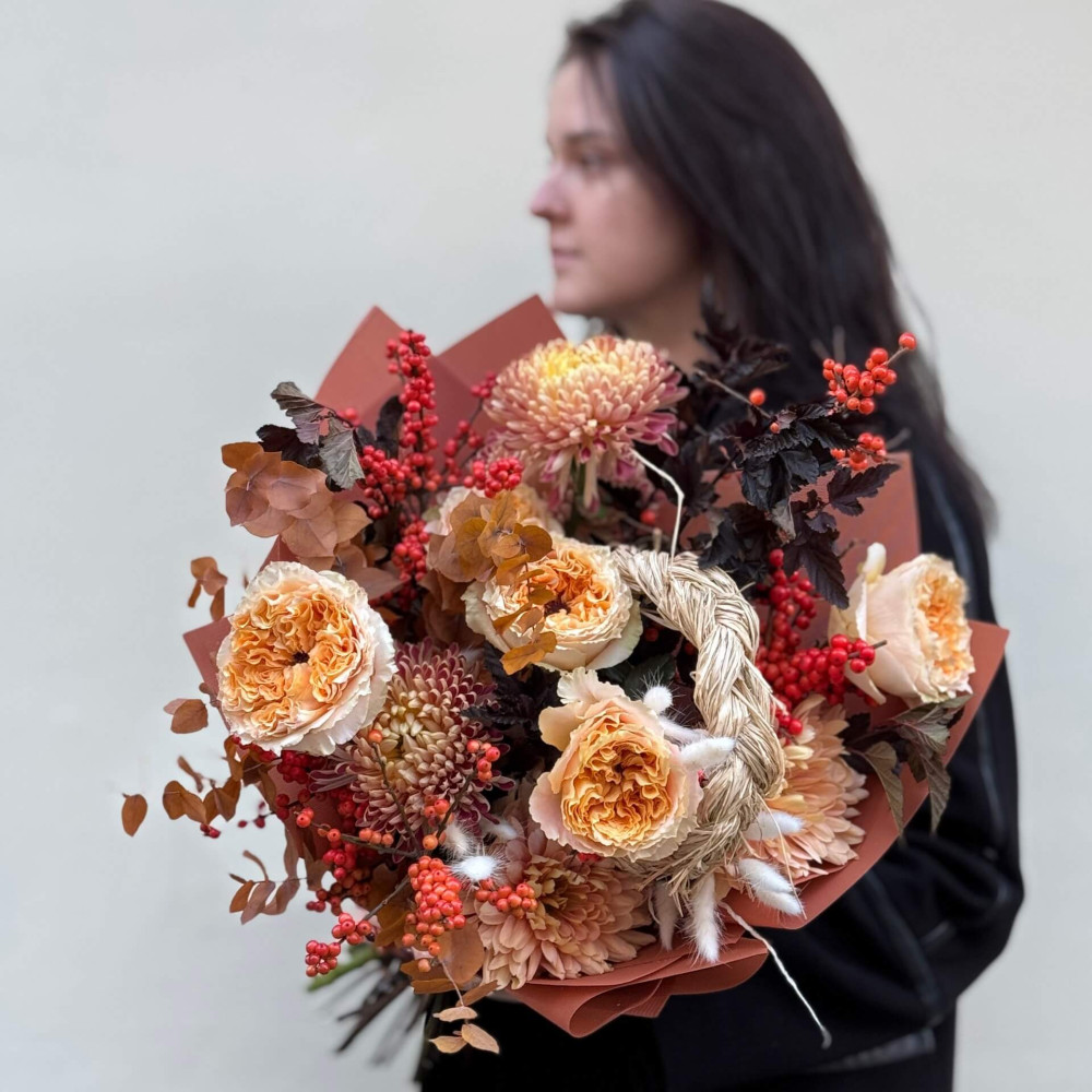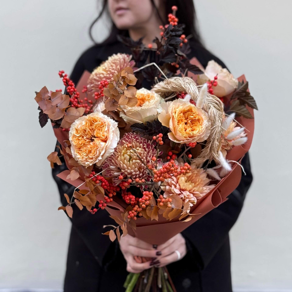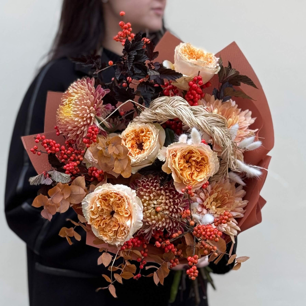 - Як замовити Стильний букет з хризантемою та піоновидною трояндою Crystal «Затишна осінь»? ❯