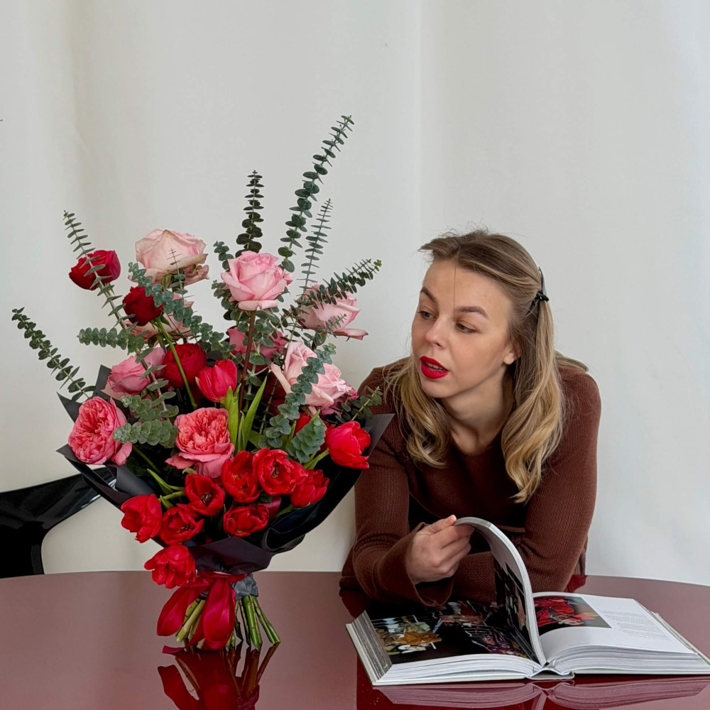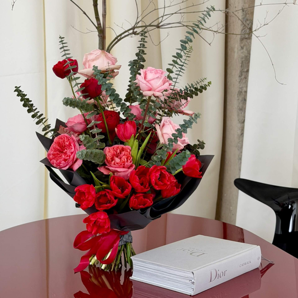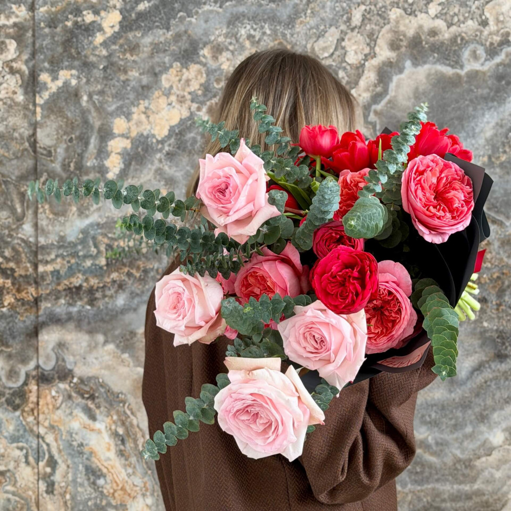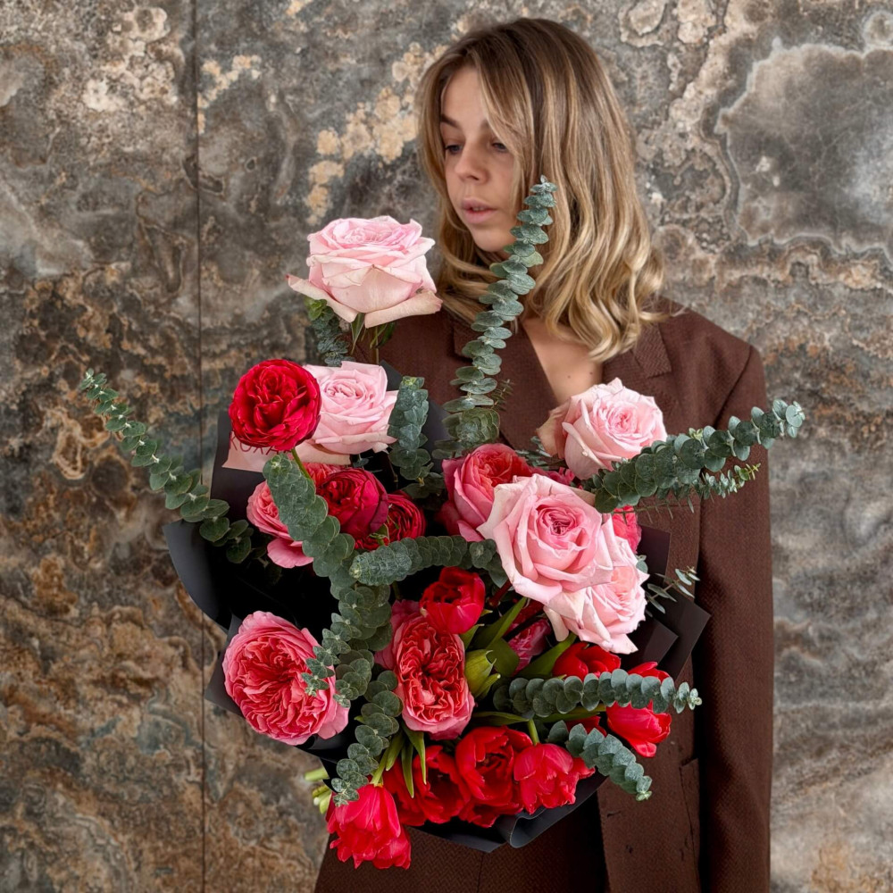 - Як замовити Стильний різнорівневий букет із різновидами піоновидних троянд та піоновидних тюльпанів «Пристрасть твоїх почуттів»? ❯