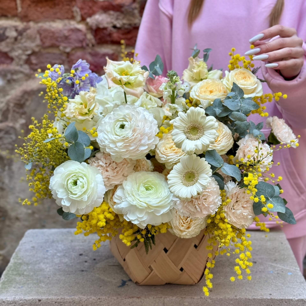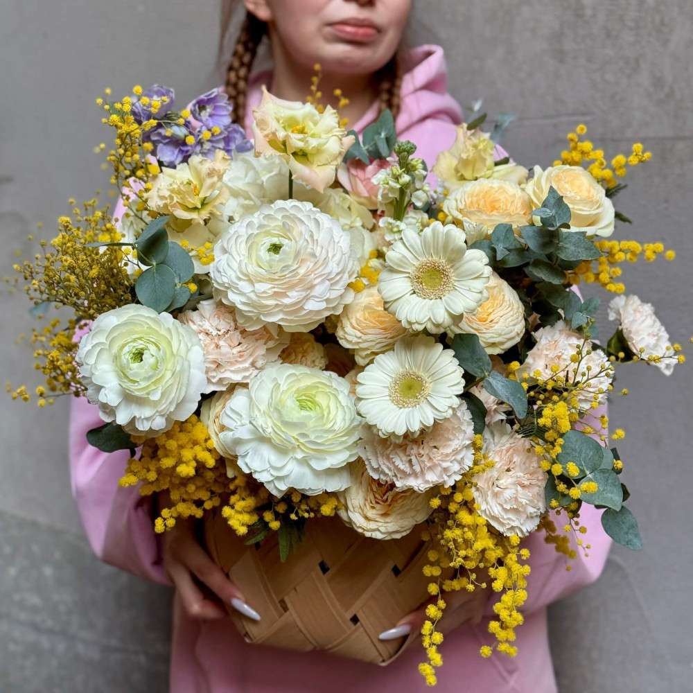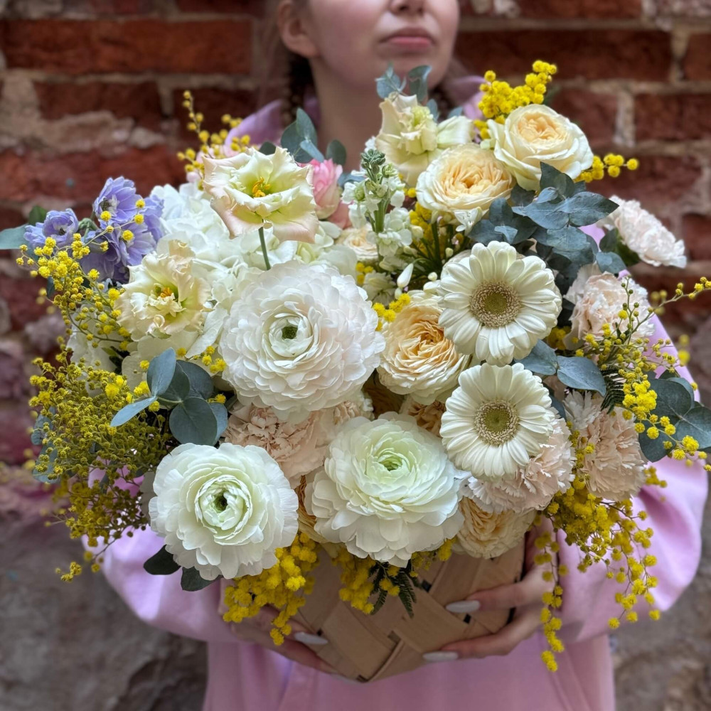 Квіти: Ранункулюс, Діантус (Гвоздика), Троянда піоновидна кущова, Дельфініум, Мімоза, Матіола, Еустома, Евкаліпт