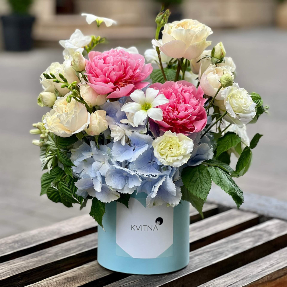 Нехай композиція (коробка, кошик, сніп) з квітами від Квітна тішить Вас якнайдовше!