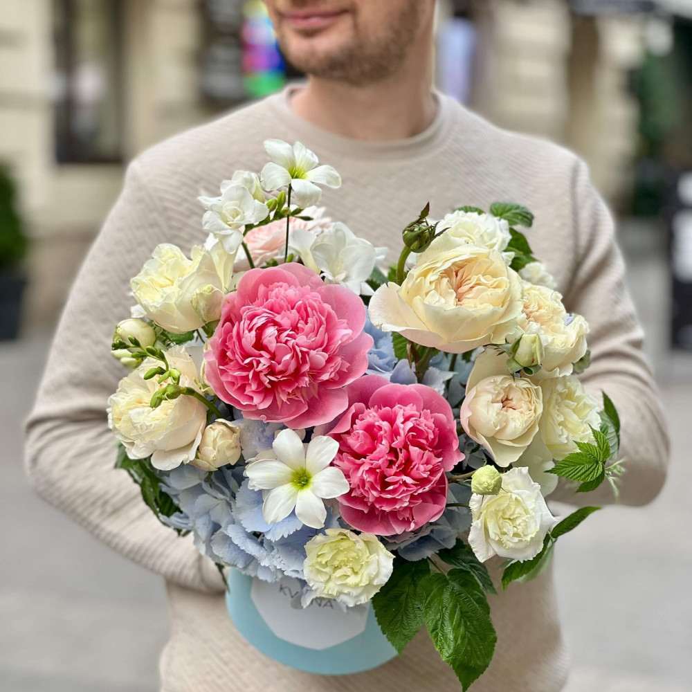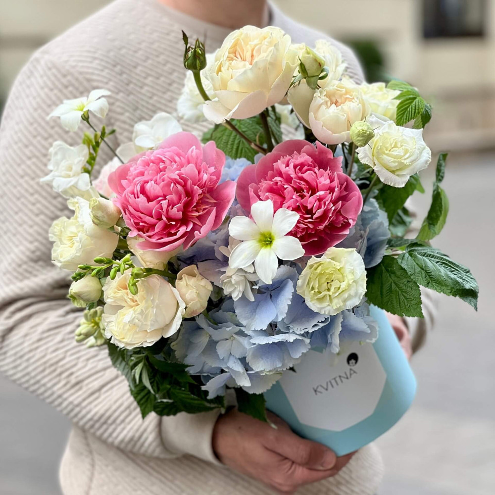 Квіти: Еустома, Малина (листя), Півонія, Гортензія, Фрезія, Троянда
