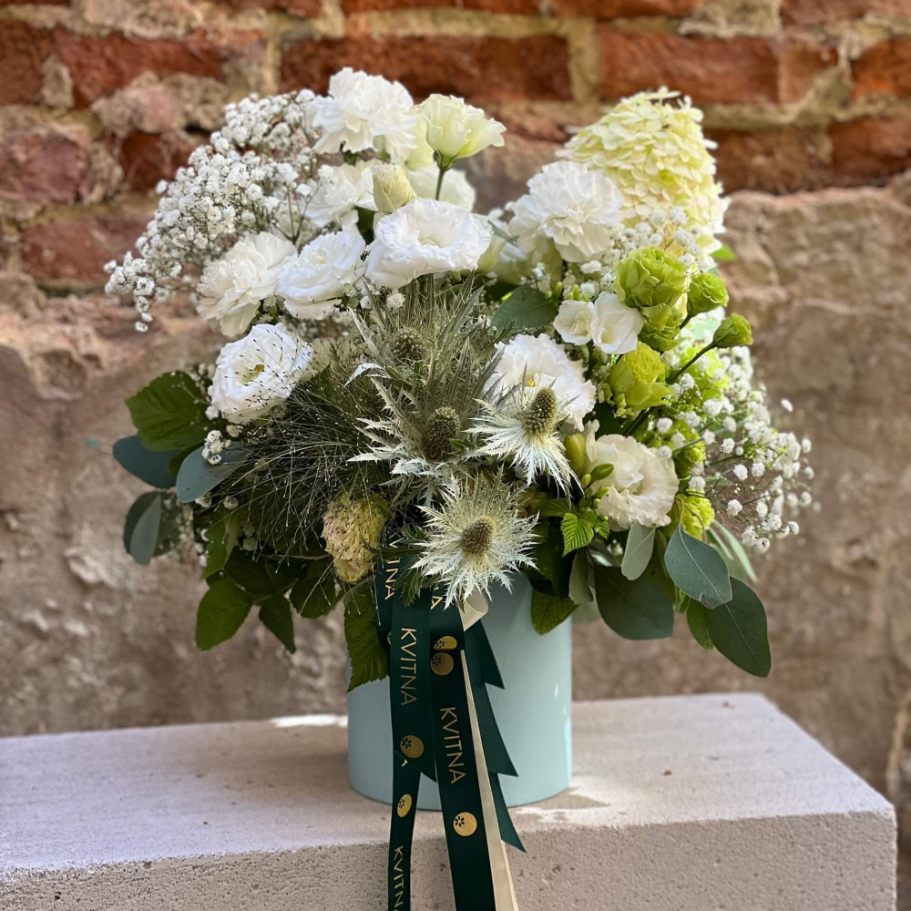 Нехай композиція (коробка, кошик, сніп) з квітами від Квітна тішить Вас якнайдовше!