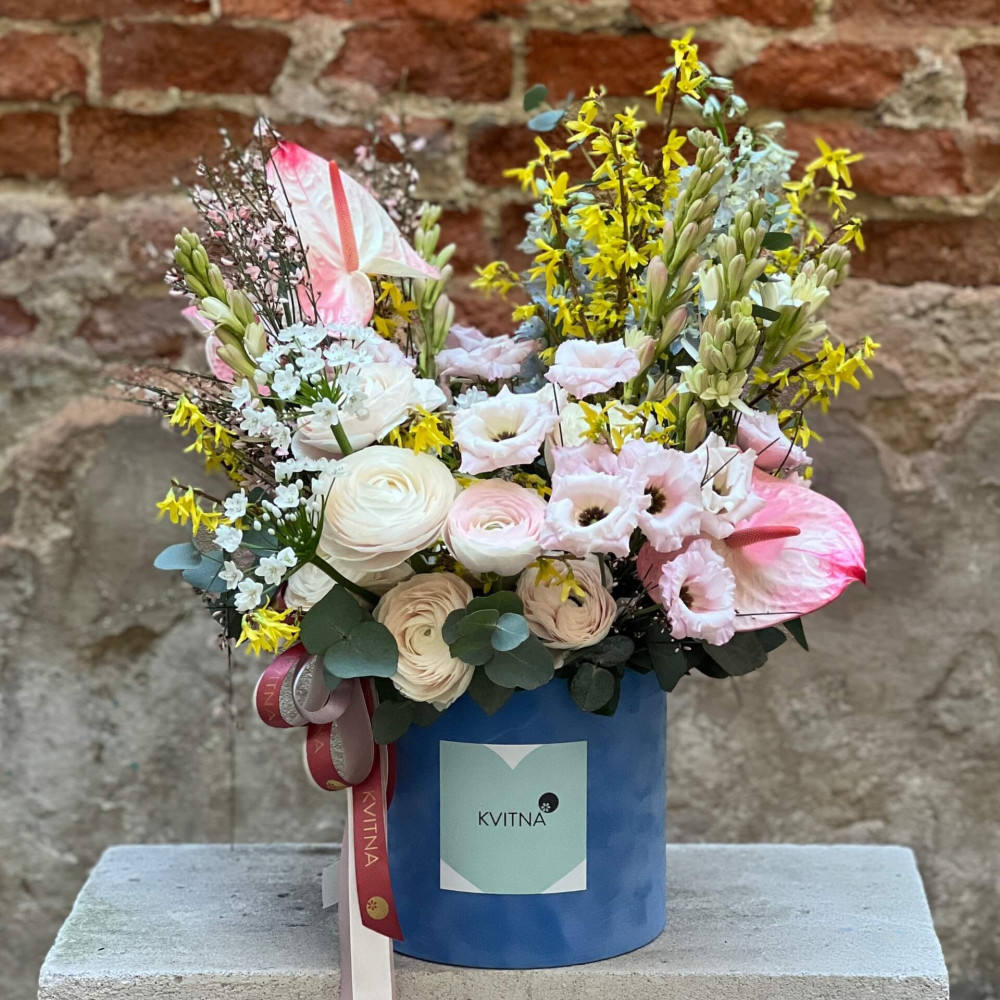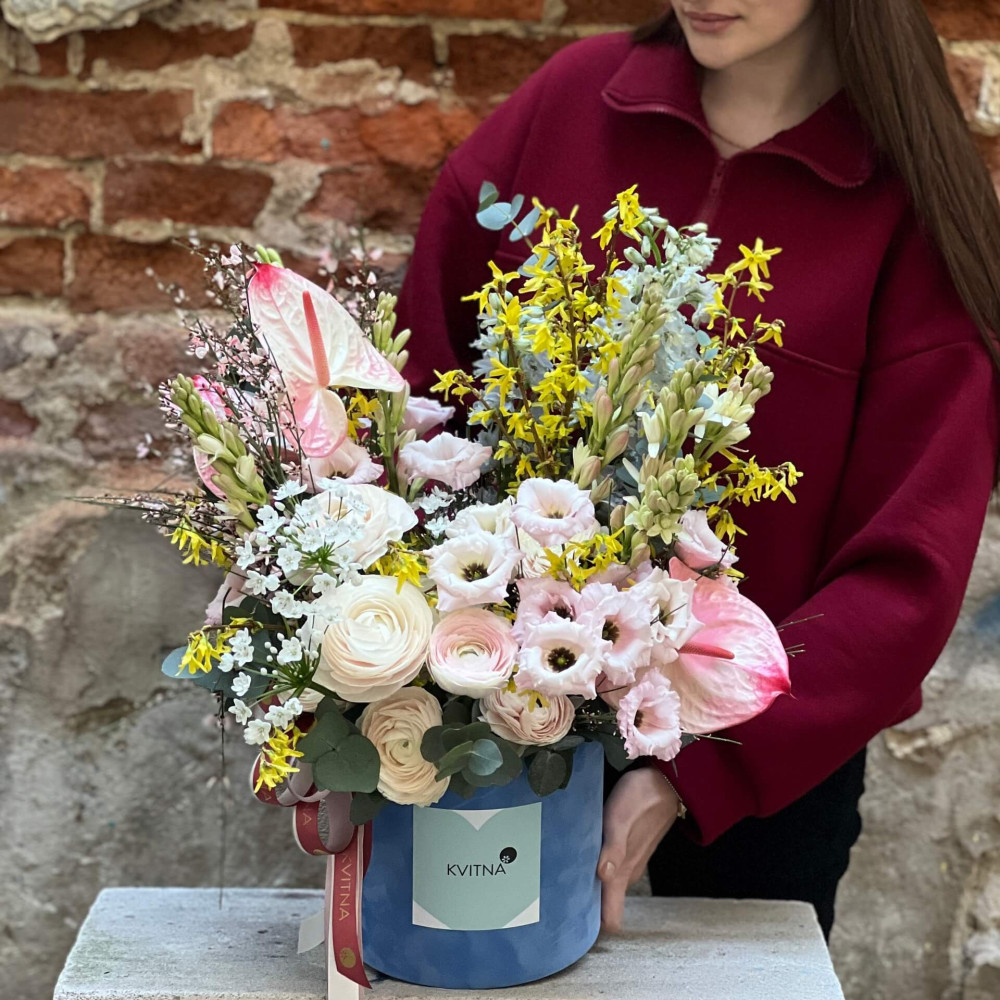 Квіти: Еустома, Ранункулюс, Форзиція, Евкаліпт, Дельфініум, Тубероза, Антуріум, Алліум, Геніста