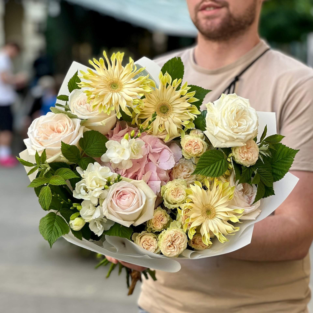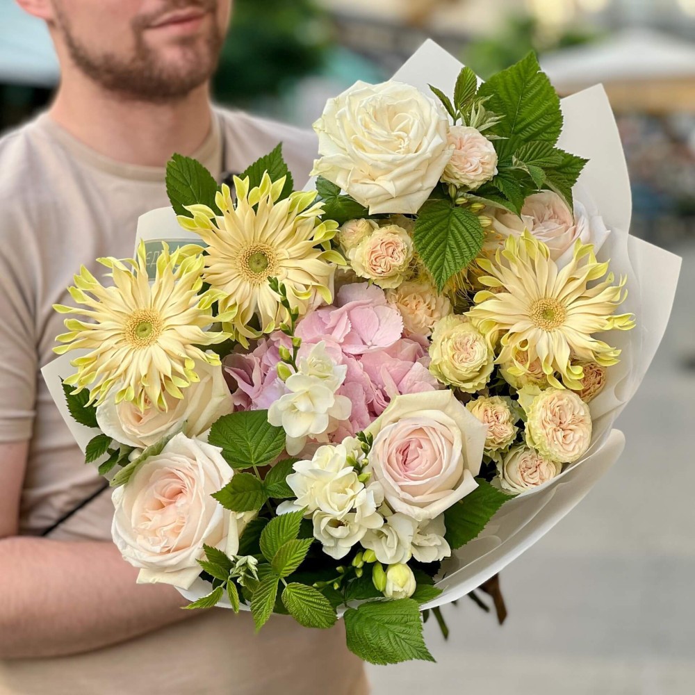 Квіти: Фрезія, Еремурус, Малина (листя), Гортензія, Троянда піоновидна, Гербера, Троянда піоновидна кущова