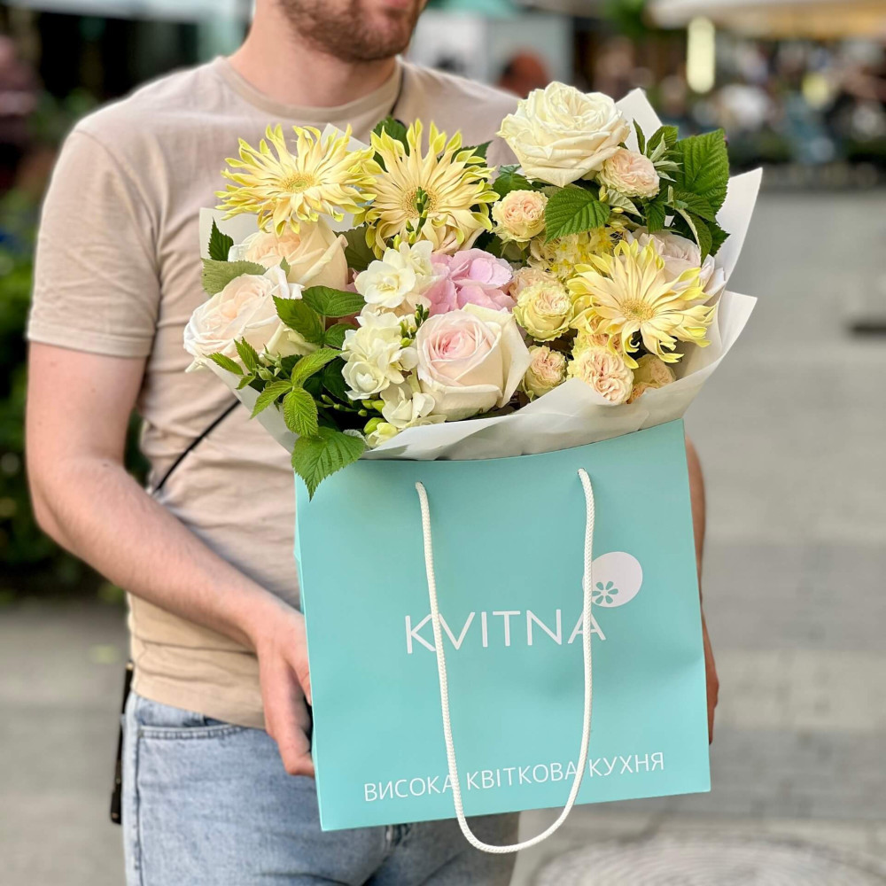 І це, до речі, зовсім не обов'язково плюси, це особливості, які потрібно розуміти. Тоді і вибір «де купити букет у Львові» зробити буде значно простіше.- Кожен букет Kvitna унікальний. Це означає, якщо Ви замовите у нас якийсь із букетів на сайті, то Ви не отримаєте точнісінько такий же. Деяких це бентежить, такі люди не хочуть «ризикувати», бажають «в точності, як на світлині». У «Квітна» кожен букет — це творчий пошук, це захоплення, злиття з квітами, образом одержувача і завданням. Так, ми можемо прийняти за вектор, зробити схожий букет, в тому ж стилі, кольоровій гамі, з тих самих квітів ... Але нам нудно робити за шаблоном. Адже букет, представлений на зображенні, робився для іншої людини, з іншого приводу, під інший настрій і натхнення. У Вас буде все по-іншому.