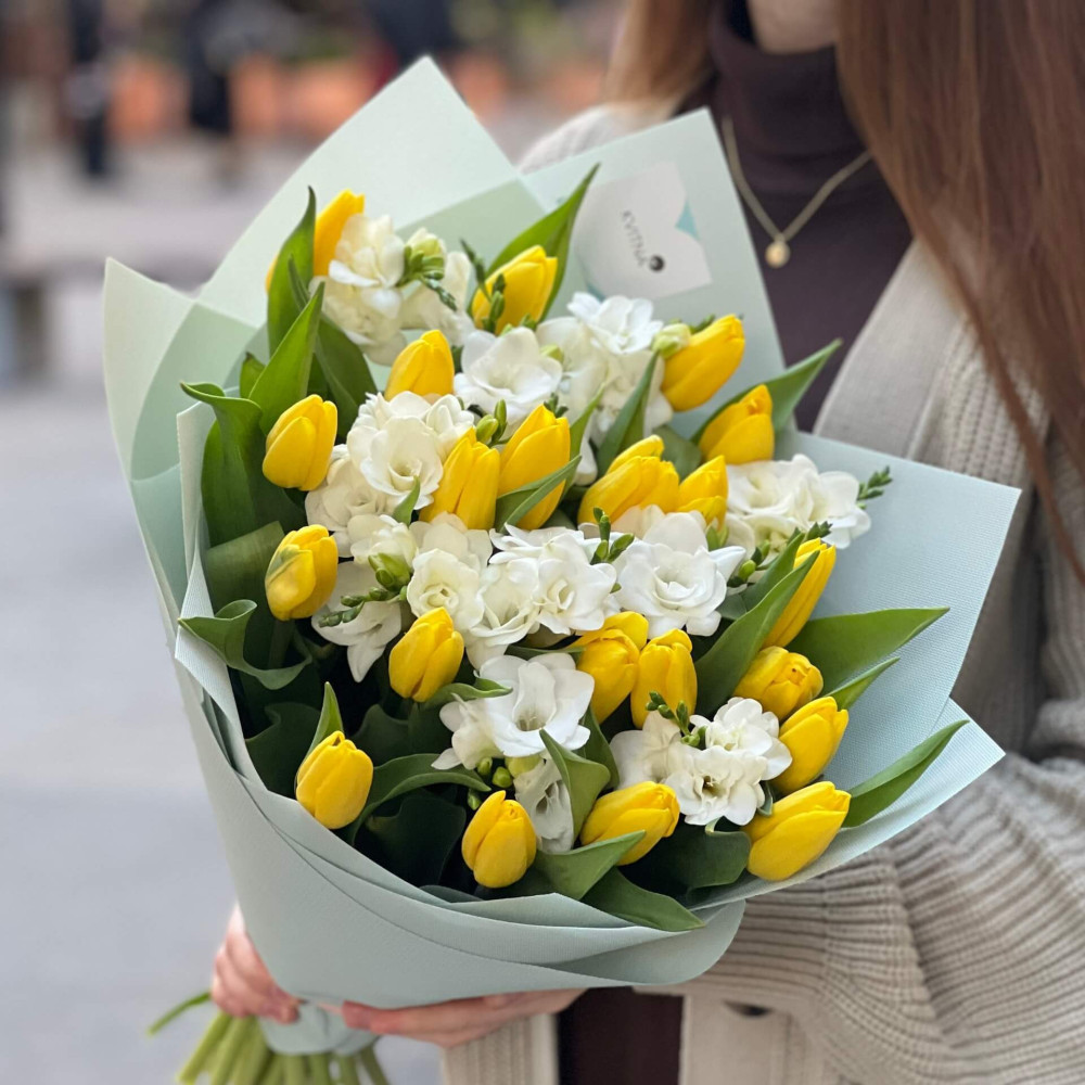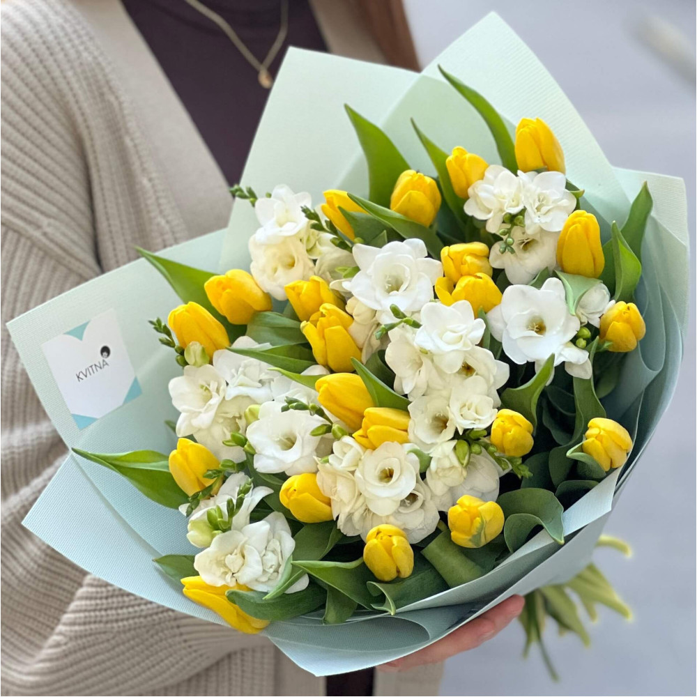 - Як замовити Світлий ароматний букет із тюльпанів і фрезій «Сонячні діаманти»? ❯