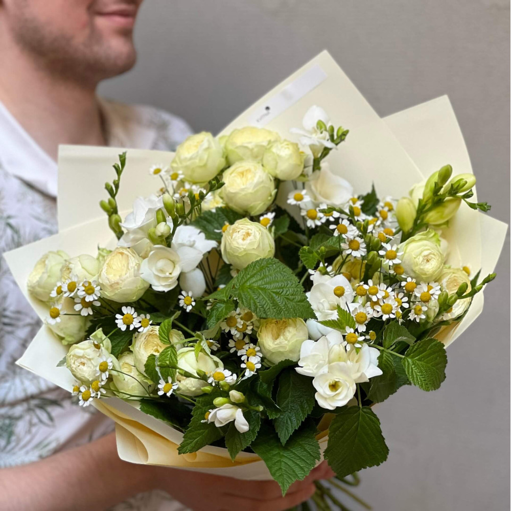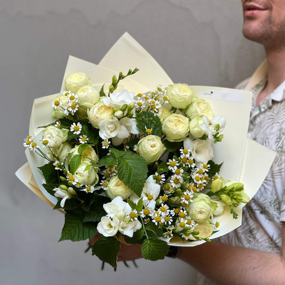 - Як замовити Світлий ароматний букет з піоновидною трояндою «Ромашковий лимонад»? ❯
