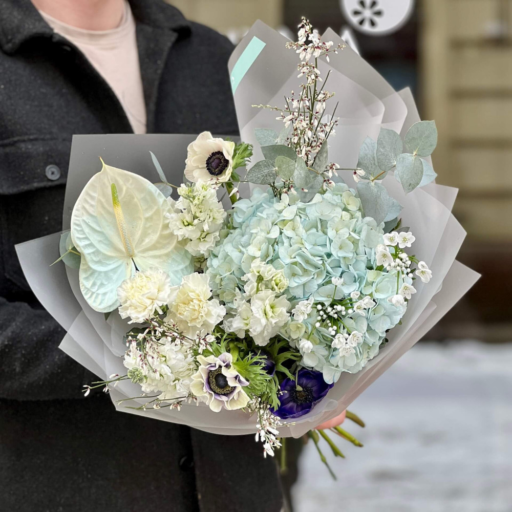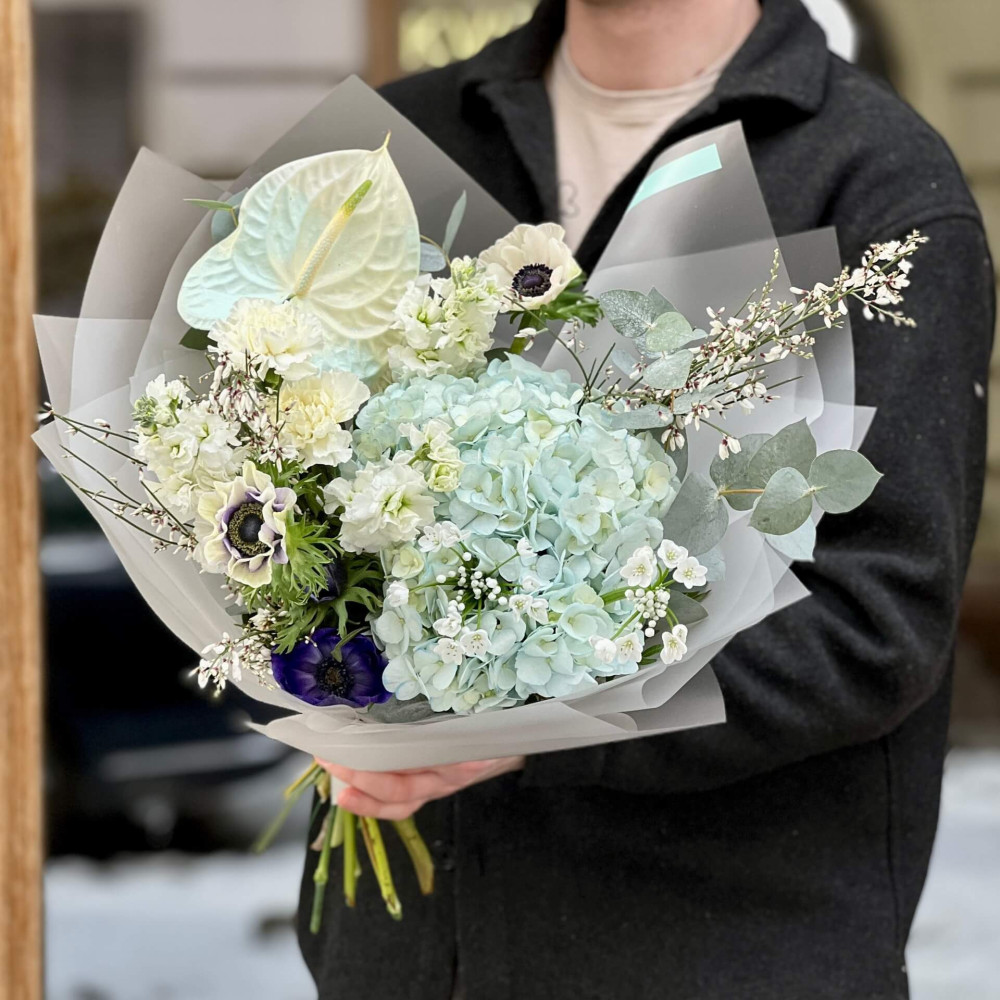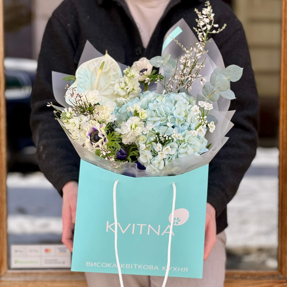 Чарівна прохолодна пастель блакитного неба посміхається тобі гортензією, легкий, мов крило пташки, антуріум дарує невагомість. Твоя невагомість в тебе в руках.