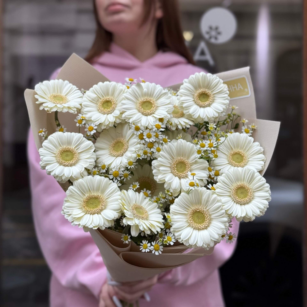 - Як замовити Світлий букет з герберами і танацетумом «Чарівне поле»? ❯