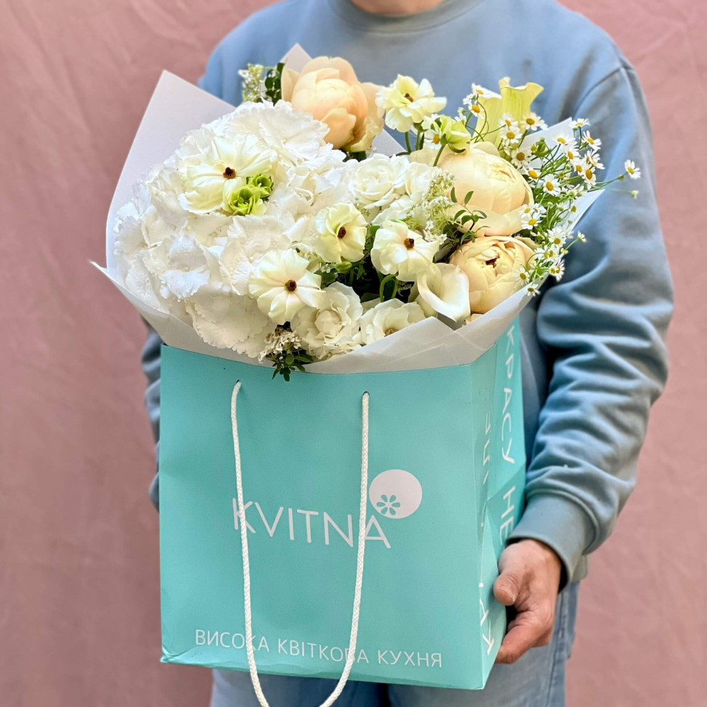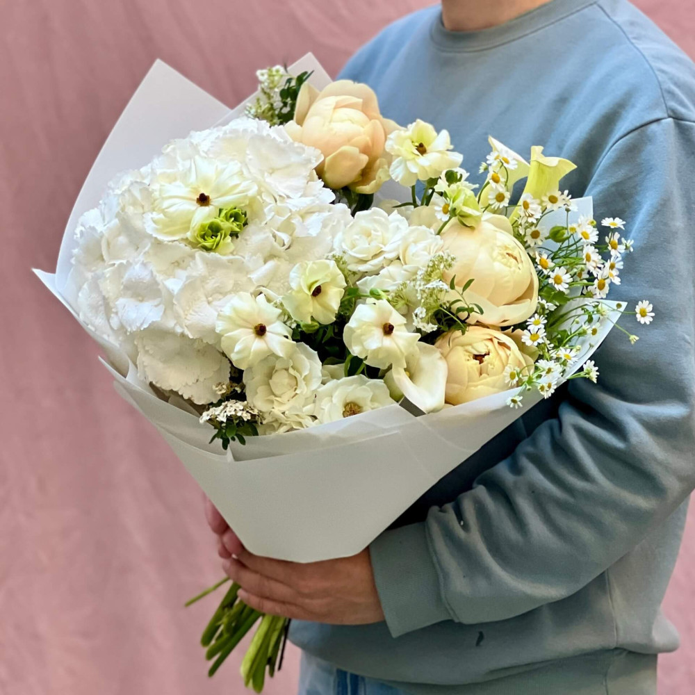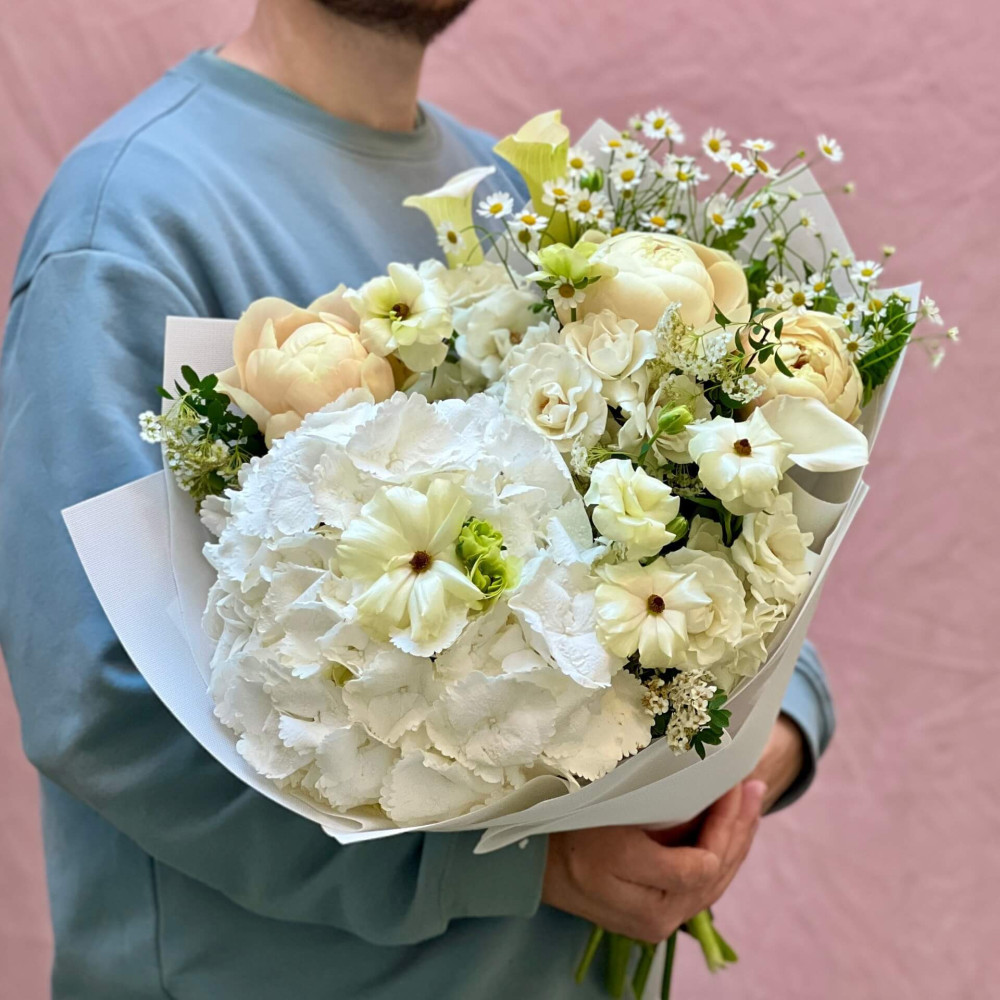 - Як замовити Світлий букет з гортензією та півоніями «Народження місяця»? ❯