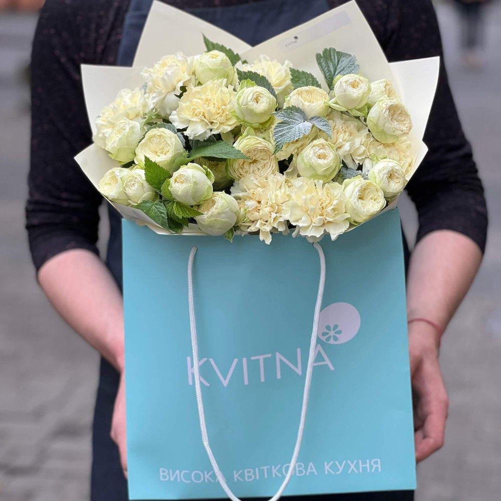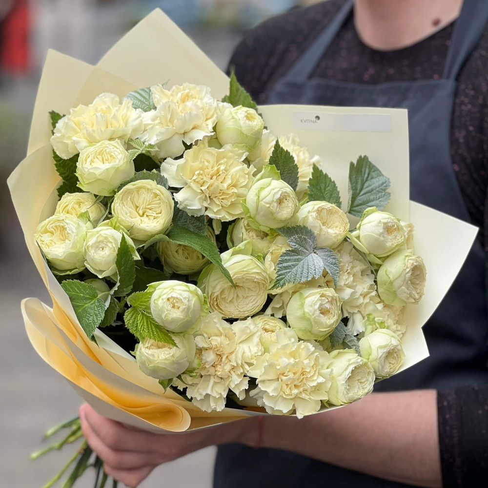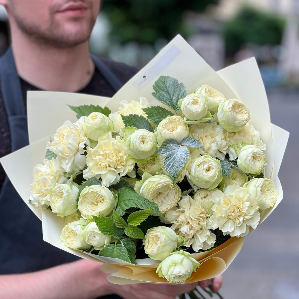 - Як замовити Світлий букет з кущовою піоновидною трояндою «Вершкова насолода»? ❯